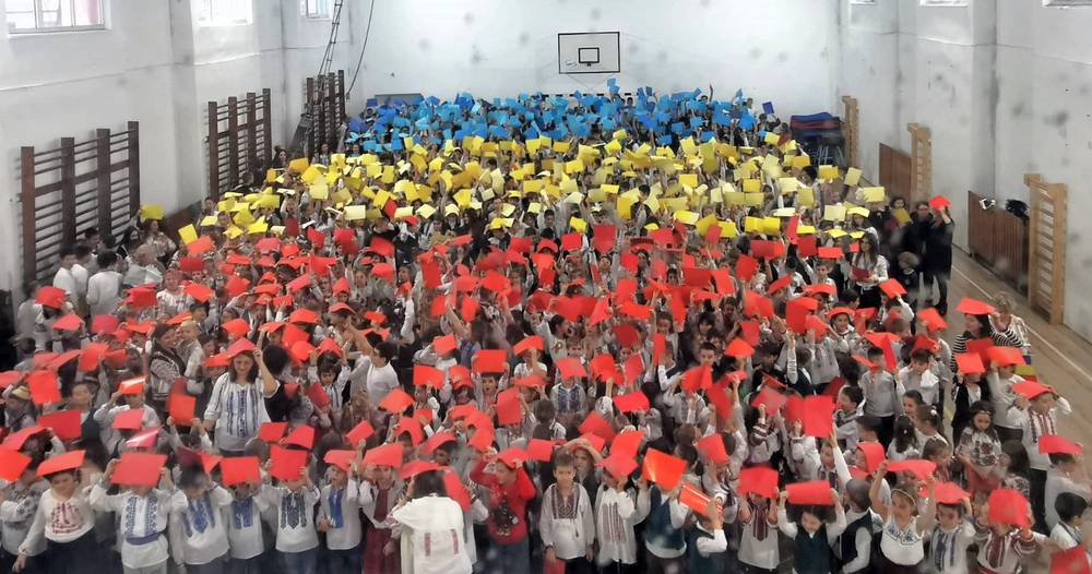 În pauza mare, elevii școlii, împreună cu învățătorii și diriginții, s-au mobilizat exemplar și au umplut sala de sport într-un moment de implicare colectivă, formând un tricolor uriaș din cartoane roșii, galbene și albastre, în timp ce au cântat cu multă emoție Imnul României.