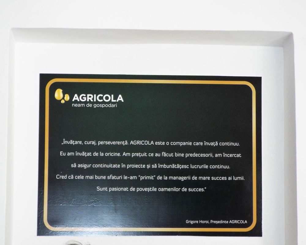 „Învățare, curaj, perseverență. Agricola este o companie care învață continuu. Eu am învățat de la oricine. Am prețuit ce au făcut bine predecesorii, am încercat să asigur continuitate în proiecte și să îmbunătățesc lucrurile continuu. Cred că cele mai bune sfaturi le-am «primit» de la managerii de mare succes ai lumii. Sunt pasionat de poveștile oamenilor de succes”.