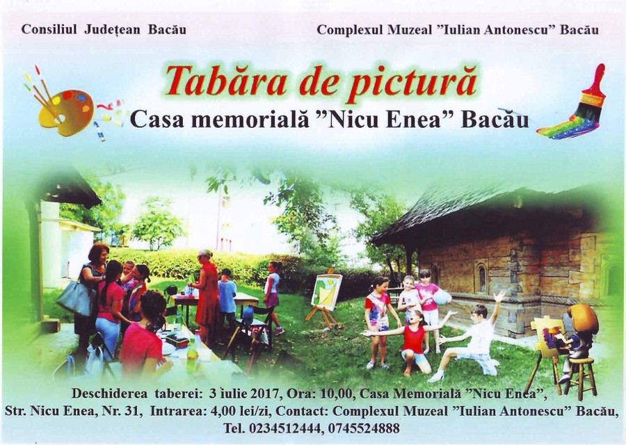 Complexul Muzeal „Iulian Antonescu” Bacău organizează în cadrul proiectului “Prietenii pictorului Nicu Enea”, o tabără de pictură cu tema “Portrete şi locuri”. Obiectivul principal al acestei manifestări îl reprezintă facilitarea, sprijinirea şi impulsionarea creaţiei artistice a copiilor, dar şi a persoanelor mature participante.