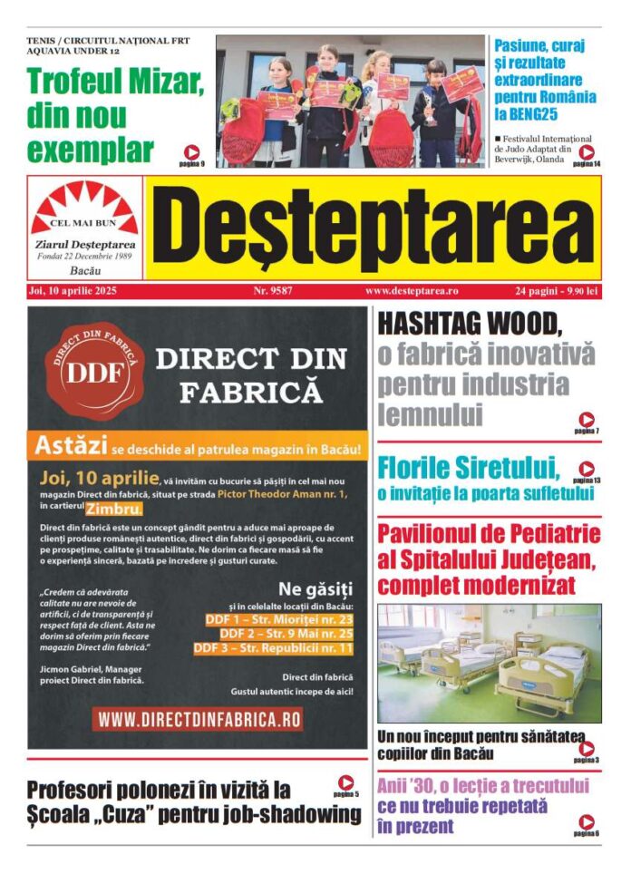 10 aprilie 2025 Deșteptarea10 aprilie 2025AcțiuneFacebookTwitterWhatsAppTelegramVK AcțiuneFacebookTwitterWhatsAppTelegramVK Rezultatele finale ale Concursului Interdisciplinar „Vrănceanu – Procopiu” Bacău, ediția a XXIV-a, 2025Fotbal: Ne-a părăsit Ioan Sdrobiș!Insula Misterioasă la balul Bobocilor de la Liceul Teoretic „Henri Coandă” BacăuZiua Internațională a Voluntariatului celebrată prin concurs de mediu la Palatul Copiilor BacăuU17 FC Viitorul Onești, calificare dramatică în optimile Cupei RomânieiObținerea permisului de conducere, mai simplă: cazierul judiciar este verificat direct la ghișeuAvertisment dur de la Garda de Mediu Bacău: un operator economic din Ardeoani, sancționat drastic pentru poluareJandarmii băcăuani i-au adus căldură lui Nea Vasile, 74 de aniFotbal/ Liga 3: Viitorul Onești câștigă, FC Bacău 2 încheie la egalitate un meci dramatic, iar Aerostar pierde acasăClubul Sportiv Bronx, rezultate remarcabile la competiția din Houlegate, FranțaConferința „Excelență, inovație și performanță în medicină” – un eveniment de referință pentru comunitatea medicală băcăuanăSub semnul recunoștinței și al binelui comun la hramul bisericii „Sfântul Nicolae” din Bacău
