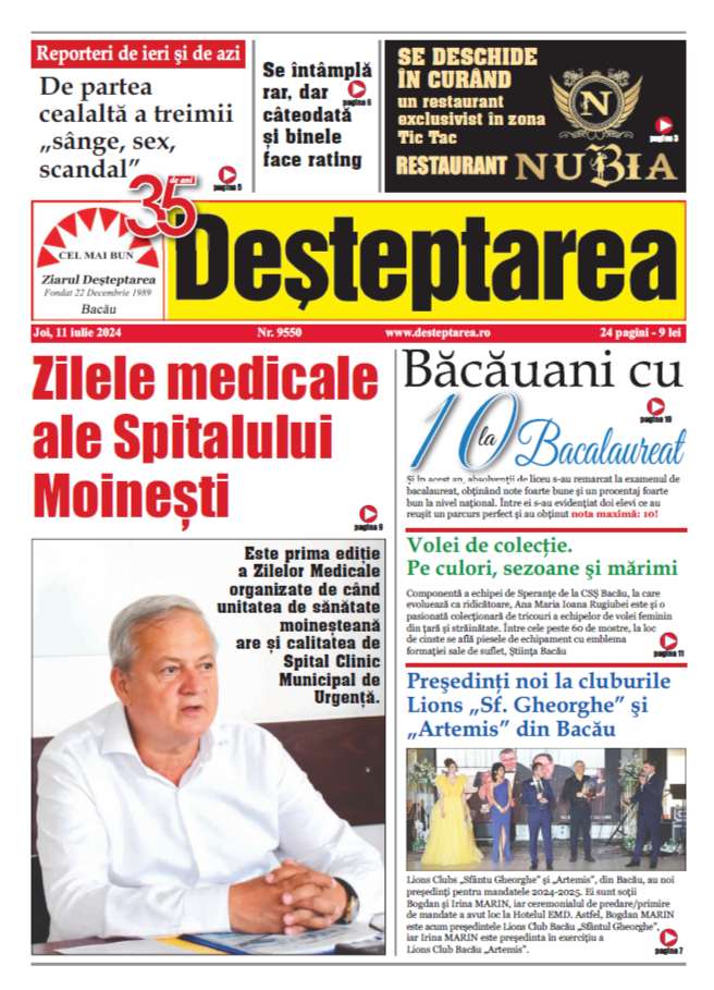 11 iulie 2024 Deșteptarea11 iulie 2024AcțiuneFacebookTwitterWhatsAppTelegramVK AcțiuneFacebookTwitterWhatsAppTelegramVK Peste 30 de intervenții gestionate de pompierii băcăuani în acest weekendRezultatele finale ale Concursului Interdisciplinar „Vrănceanu – Procopiu” Bacău, ediția a XXIV-a, 2025Fotbal: Ne-a părăsit Ioan Sdrobiș!Insula Misterioasă la balul Bobocilor de la Liceul Teoretic „Henri Coandă” BacăuZiua Internațională a Voluntariatului celebrată prin concurs de mediu la Palatul Copiilor BacăuU17 FC Viitorul Onești, calificare dramatică în optimile Cupei RomânieiObținerea permisului de conducere, mai simplă: cazierul judiciar este verificat direct la ghișeuAvertisment dur de la Garda de Mediu Bacău: un operator economic din Ardeoani, sancționat drastic pentru poluareJandarmii băcăuani i-au adus căldură lui Nea Vasile, 74 de aniFotbal/ Liga 3: Viitorul Onești câștigă, FC Bacău 2 încheie la egalitate un meci dramatic, iar Aerostar pierde acasăClubul Sportiv Bronx, rezultate remarcabile la competiția din Houlegate, FranțaConferința „Excelență, inovație și performanță în medicină” – un eveniment de referință pentru comunitatea medicală băcăuană