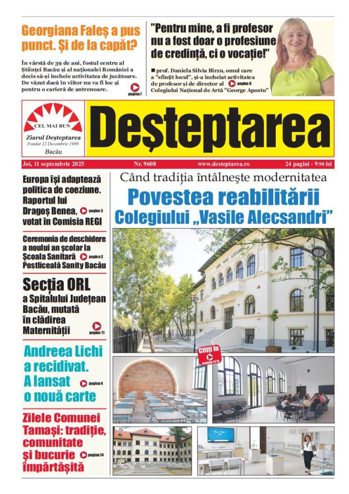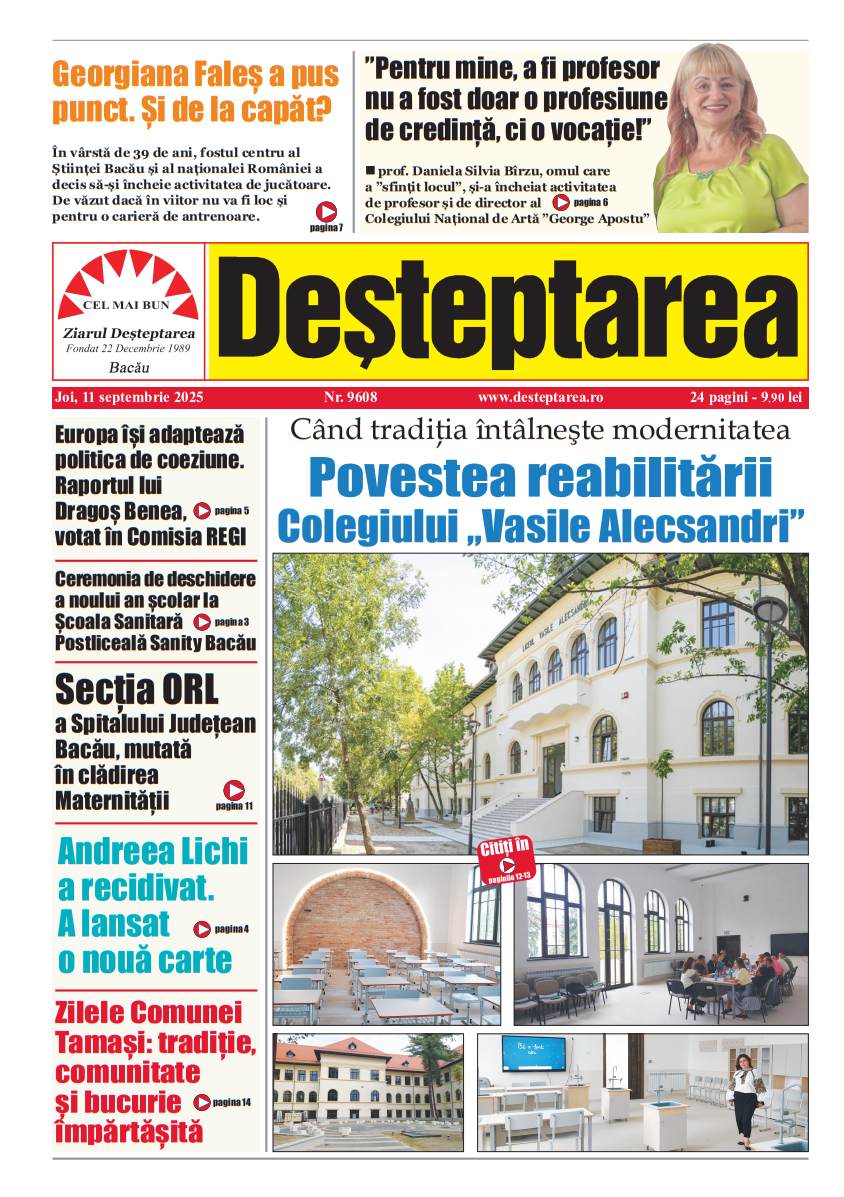 11 septembrie 2025 Deșteptarea11 septembrie 2025AcțiuneFacebookTwitterWhatsAppTelegramVK AcțiuneFacebookTwitterWhatsAppTelegramVK Fotbal: Ne-a părăsit Ioan Sdrobiș!Insula Misterioasă la balul Bobocilor de la Liceul Teoretic „Henri Coandă” BacăuZiua Internațională a Voluntariatului celebrată prin concurs de mediu la Palatul Copiilor BacăuU17 FC Viitorul Onești, calificare dramatică în optimile Cupei RomânieiObținerea permisului de conducere, mai simplă: cazierul judiciar este verificat direct la ghișeuAvertisment dur de la Garda de Mediu Bacău: un operator economic din Ardeoani, sancționat drastic pentru poluareJandarmii băcăuani i-au adus căldură lui Nea Vasile, 74 de aniFotbal/ Liga 3: Viitorul Onești câștigă, FC Bacău 2 încheie la egalitate un meci dramatic, iar Aerostar pierde acasăClubul Sportiv Bronx, rezultate remarcabile la competiția din Houlegate, FranțaConferința „Excelență, inovație și performanță în medicină” – un eveniment de referință pentru comunitatea medicală băcăuanăSub semnul recunoștinței și al binelui comun la hramul bisericii „Sfântul Nicolae” din BacăuElevi ai Liceului Tehnologic Târgu Ocna, în recital la „Sunetul colindelor în inima muntelui de sare”