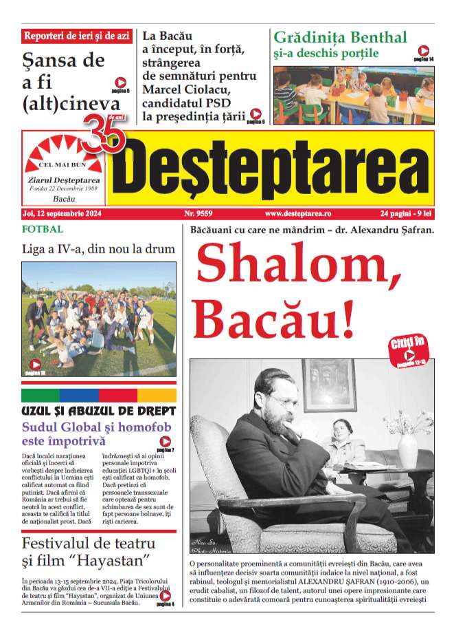12 septembrie 2024 Deșteptarea12 septembrie 2024AcțiuneFacebookTwitterWhatsAppTelegramVK AcțiuneFacebookTwitterWhatsAppTelegramVK Peste 30 de intervenții gestionate de pompierii băcăuani în acest weekendRezultatele finale ale Concursului Interdisciplinar „Vrănceanu – Procopiu” Bacău, ediția a XXIV-a, 2025Fotbal: Ne-a părăsit Ioan Sdrobiș!Insula Misterioasă la balul Bobocilor de la Liceul Teoretic „Henri Coandă” BacăuZiua Internațională a Voluntariatului celebrată prin concurs de mediu la Palatul Copiilor BacăuU17 FC Viitorul Onești, calificare dramatică în optimile Cupei RomânieiObținerea permisului de conducere, mai simplă: cazierul judiciar este verificat direct la ghișeuAvertisment dur de la Garda de Mediu Bacău: un operator economic din Ardeoani, sancționat drastic pentru poluareJandarmii băcăuani i-au adus căldură lui Nea Vasile, 74 de aniFotbal/ Liga 3: Viitorul Onești câștigă, FC Bacău 2 încheie la egalitate un meci dramatic, iar Aerostar pierde acasăClubul Sportiv Bronx, rezultate remarcabile la competiția din Houlegate, FranțaConferința „Excelență, inovație și performanță în medicină” – un eveniment de referință pentru comunitatea medicală băcăuană