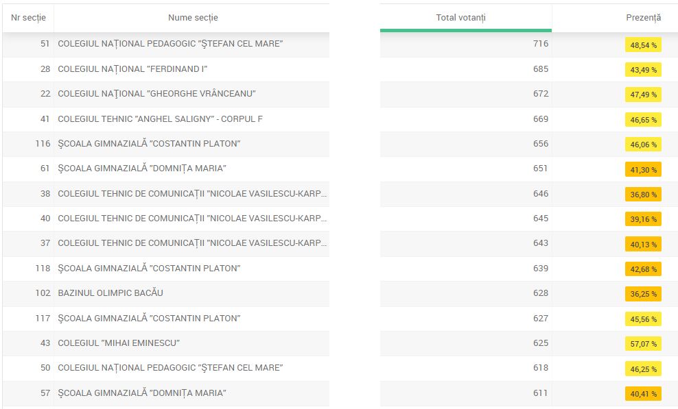 Cel mai mare procent de prezență s-a înregistrat la secția de la Primăria Filipeni – 66,23 % în vreme ce procentul cel mai scăzut a fost la Secția 18 Bacau (Școala Mihai Drăgan) – 7,98%