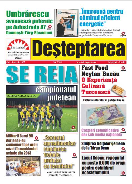 13 martie 2025 Deșteptarea13 martie 2025AcțiuneFacebookTwitterWhatsAppTelegramVK AcțiuneFacebookTwitterWhatsAppTelegramVK Rezultatele finale ale Concursului Interdisciplinar „Vrănceanu – Procopiu” Bacău, ediția a XXIV-a, 2025Fotbal: Ne-a părăsit Ioan Sdrobiș!Insula Misterioasă la balul Bobocilor de la Liceul Teoretic „Henri Coandă” BacăuZiua Internațională a Voluntariatului celebrată prin concurs de mediu la Palatul Copiilor BacăuU17 FC Viitorul Onești, calificare dramatică în optimile Cupei RomânieiObținerea permisului de conducere, mai simplă: cazierul judiciar este verificat direct la ghișeuAvertisment dur de la Garda de Mediu Bacău: un operator economic din Ardeoani, sancționat drastic pentru poluareJandarmii băcăuani i-au adus căldură lui Nea Vasile, 74 de aniFotbal/ Liga 3: Viitorul Onești câștigă, FC Bacău 2 încheie la egalitate un meci dramatic, iar Aerostar pierde acasăClubul Sportiv Bronx, rezultate remarcabile la competiția din Houlegate, FranțaConferința „Excelență, inovație și performanță în medicină” – un eveniment de referință pentru comunitatea medicală băcăuanăSub semnul recunoștinței și al binelui comun la hramul bisericii „Sfântul Nicolae” din Bacău