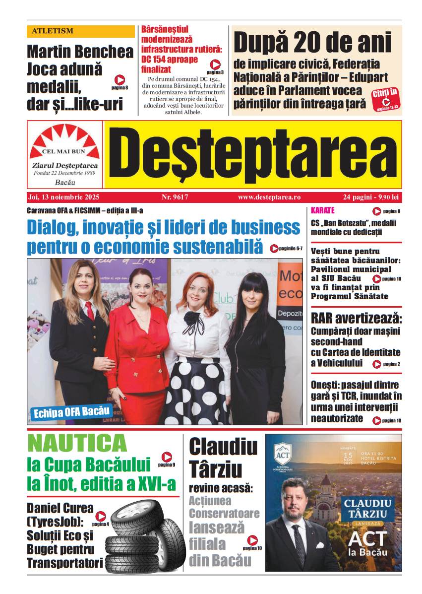13 noiembrie 2025 Deșteptarea13 noiembrie 2025AcțiuneFacebookTwitterWhatsAppTelegramVK AcțiuneFacebookTwitterWhatsAppTelegramVK Jandarmii băcăuani i-au adus căldură lui Nea Vasile, 74 de aniFotbal/ Liga 3: Viitorul Onești câștigă, FC Bacău 2 încheie la egalitate un meci dramatic, iar Aerostar pierde acasăClubul Sportiv Bronx, rezultate remarcabile la competiția din Houlegate, FranțaConferința „Excelență, inovație și performanță în medicină” – un eveniment de referință pentru comunitatea medicală băcăuanăSub semnul recunoștinței și al binelui comun la hramul bisericii „Sfântul Nicolae” din BacăuElevi ai Liceului Tehnologic Târgu Ocna, în recital la „Sunetul colindelor în inima muntelui de sare”Spitalul din Buhuși va deschide în 2026 un program de chirurgie robotică – un pas major pentru medicina din nord-estul țăriiCând Cel Drept vindecă gârbovirea celei smerite (Luca 13, 10- 17)Duminica a II din AdventAcțiunea Conservatoare Bacău a constituit organizația locală OneștiInformare privind cele mai bune practici de utilizare a produselor biocide Decembrie 2025Moș Nicolae a venit și la copiii internați la „Pediatrie”