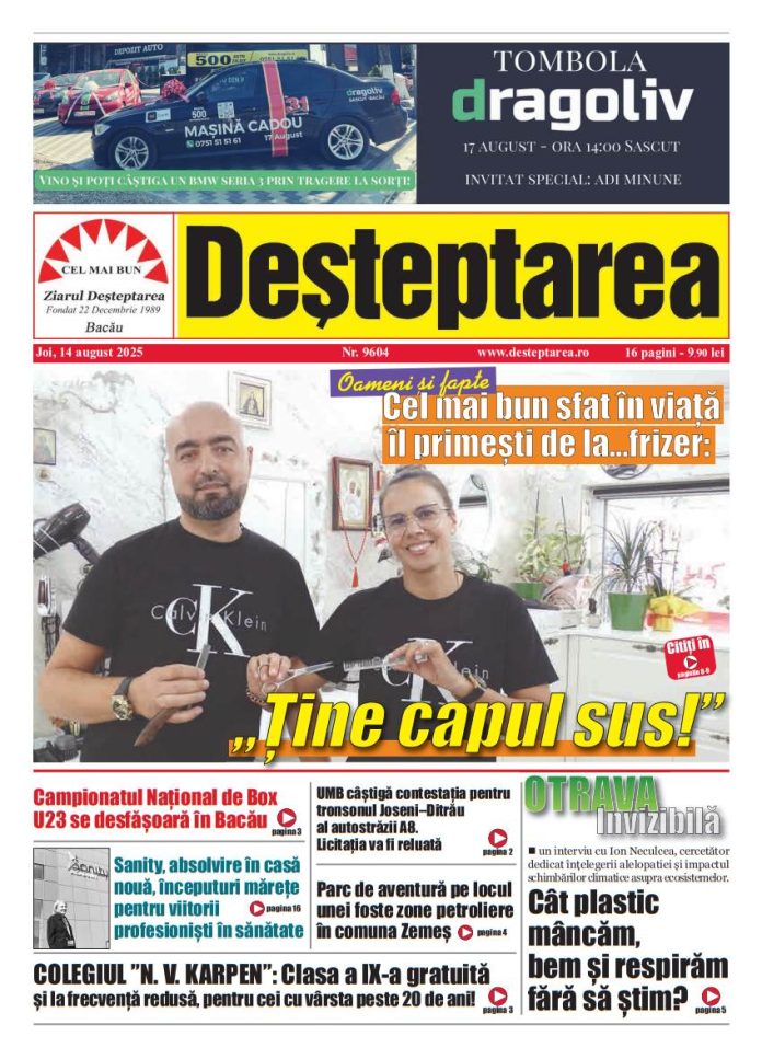 14 august 2025 Deșteptarea14 august 2025AcțiuneFacebookTwitterWhatsAppTelegramVK AcțiuneFacebookTwitterWhatsAppTelegramVK Fotbal: Ne-a părăsit Ioan Sdrobiș!Insula Misterioasă la balul Bobocilor de la Liceul Teoretic „Henri Coandă” BacăuZiua Internațională a Voluntariatului celebrată prin concurs de mediu la Palatul Copiilor BacăuU17 FC Viitorul Onești, calificare dramatică în optimile Cupei RomânieiObținerea permisului de conducere, mai simplă: cazierul judiciar este verificat direct la ghișeuAvertisment dur de la Garda de Mediu Bacău: un operator economic din Ardeoani, sancționat drastic pentru poluareJandarmii băcăuani i-au adus căldură lui Nea Vasile, 74 de aniFotbal/ Liga 3: Viitorul Onești câștigă, FC Bacău 2 încheie la egalitate un meci dramatic, iar Aerostar pierde acasăClubul Sportiv Bronx, rezultate remarcabile la competiția din Houlegate, FranțaConferința „Excelență, inovație și performanță în medicină” – un eveniment de referință pentru comunitatea medicală băcăuanăSub semnul recunoștinței și al binelui comun la hramul bisericii „Sfântul Nicolae” din BacăuElevi ai Liceului Tehnologic Târgu Ocna, în recital la „Sunetul colindelor în inima muntelui de sare”