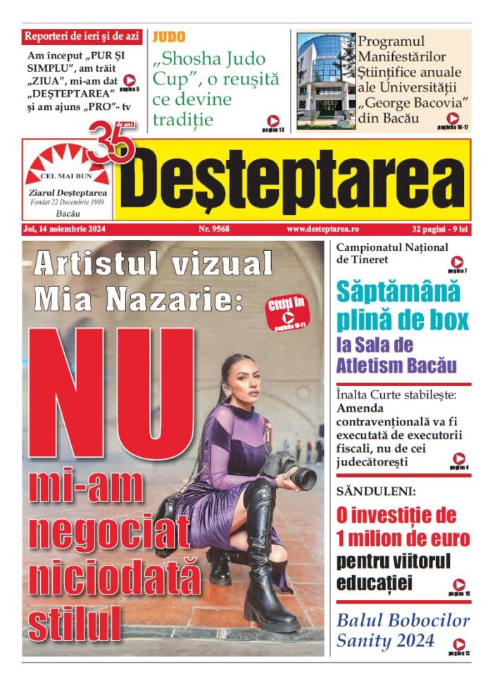 14 noiembrie 2024 Deșteptarea14 noiembrie 2024AcțiuneFacebookTwitterWhatsAppTelegramVK AcțiuneFacebookTwitterWhatsAppTelegramVK Rezultatele finale ale Concursului Interdisciplinar „Vrănceanu – Procopiu” Bacău, ediția a XXIV-a, 2025Fotbal: Ne-a părăsit Ioan Sdrobiș!Insula Misterioasă la balul Bobocilor de la Liceul Teoretic „Henri Coandă” BacăuZiua Internațională a Voluntariatului celebrată prin concurs de mediu la Palatul Copiilor BacăuU17 FC Viitorul Onești, calificare dramatică în optimile Cupei RomânieiObținerea permisului de conducere, mai simplă: cazierul judiciar este verificat direct la ghișeuAvertisment dur de la Garda de Mediu Bacău: un operator economic din Ardeoani, sancționat drastic pentru poluareJandarmii băcăuani i-au adus căldură lui Nea Vasile, 74 de aniFotbal/ Liga 3: Viitorul Onești câștigă, FC Bacău 2 încheie la egalitate un meci dramatic, iar Aerostar pierde acasăClubul Sportiv Bronx, rezultate remarcabile la competiția din Houlegate, FranțaConferința „Excelență, inovație și performanță în medicină” – un eveniment de referință pentru comunitatea medicală băcăuanăSub semnul recunoștinței și al binelui comun la hramul bisericii „Sfântul Nicolae” din Bacău
