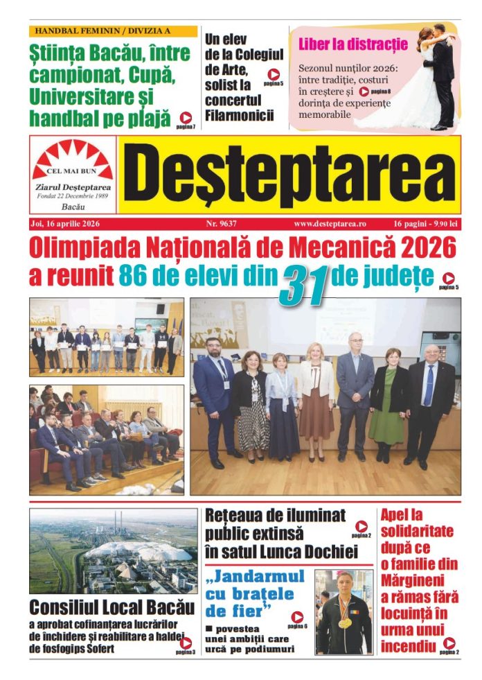 16 aprilie 2026 Deșteptarea16 aprilie 2026AcțiuneFacebookXWhatsAppTelegramVK AcțiuneFacebookXWhatsAppTelegramVK Muzeul de Științele Naturii „Ion Borcea” va avea dotări digitale interactive; investițiile depășesc 9,2 milioane leiDe Paște, pe apă: un oneștean stabilit la Constanța a coborât cu caiacul pe Trotuș, între Onești și AdjudÎntre misiunea din teren și cercetarea istoriei militare: Portret de ofițer: locotenent-colonel Ioan MarcelBărbat din Oncești, arestat preventiv după ce ar fi agresat un localnic și i-ar fi furat telefonulPatru tineri din Orbeni, reținuți pentru lovire sau alte violențeA încurcat bagajele la Aeroport și a pierdut rucsacul cu 6.000 de euroȘofer prins cu 139 km/h în localitatea Sascut, pe DN2-E85Rețeaua de iluminat public extinsă în satul Lunca Dochiei, comuna UrecheștiPropanul – piață în expansiune, dar sub presiunea tensiunilor globaleCampionatele Naționale Școlare de Gimnastică, organizate la Onești în Anul Nadia Comăneci 2026Jandarmul care urcă pe podiumul lumii: povestea lui Andrei MaziluUn elev de la Colegiul de Arte, solist la concertul Filarmonicii