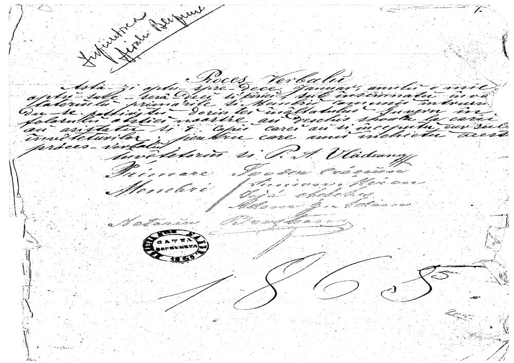 La 18 ianuarie 1865, „… sub însemnatŭ învățătorĭulŭ, primarile și Membriĭ comuniĭ întrunindu-se potrivitŭ dorințeĭ înălțatuluĭ Guvern în folosulŭ obștieĭ noastre aŭ deschis shoala la cariĭ aŭ asistatŭ și 4 copiĭ careĭ aŭ și începutŭ cursule învêțăturilor; pentru care amŭ încheiatŭ acest proces-verbalŭ”. La finalul procesului-verbal sunt menționați: învățător și preot A. Vlădeanu, primar Toader Crăciun, membri Simion Miron, Iojă Cheșcheș, Adam G. Adam și „Notarĭu Broșteanu”.