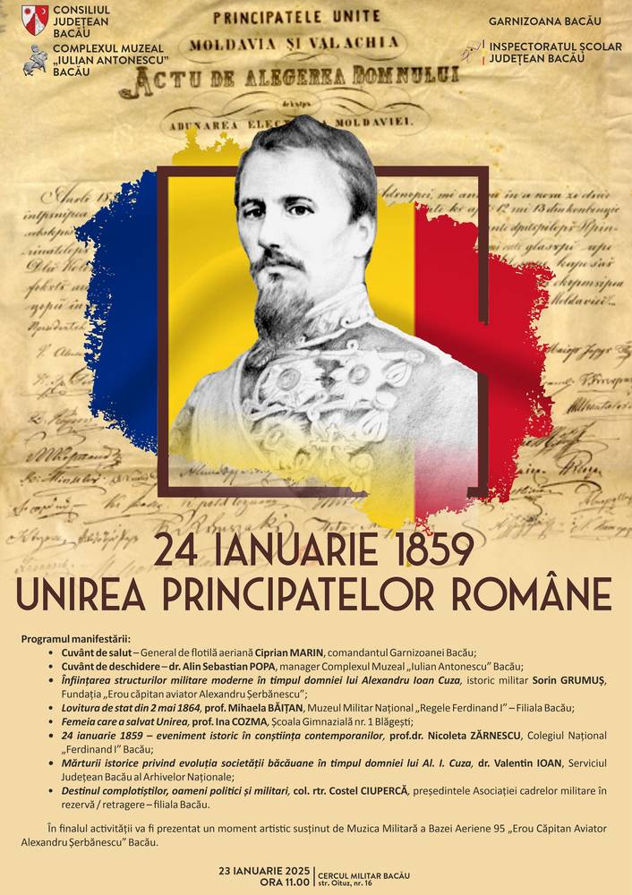 Complexul Muzeal „Iulian Antonescu” din Bacău, în parteneriat cu Garnizoana Bacău, organizează joi, 23 ianuarie 2025, un simpozion dedicat celebrării a 166 de ani de la Unirea Principatelor Române. Evenimentul, care va avea loc la Cercul Militar Bacău, începând cu ora 11:00, reunește personalități din mediul academic, cultural și militar, marcând un moment crucial din istoria modernă a României.