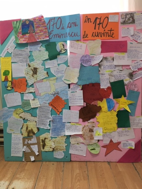 Timp de câteva zile, elevii clasei a VII-a, îndrumați de profesoara Gabriela Humă, au pregătit și asamblat un panou- omagiu poetului Mihai Eminescu, 170 de ani de Eminescu în 170 de cuvinte. Această activitate a urmărit promovarea creațiilor eminesciene într-o manieră personalizată, precum și sensibilizarea și surprinderea colegilor și cadrelor didactice cu ocazia celebrării a 170 de ani de la nașterea Luceafărului poeziei românești. Copiii au notat 170 de cuvinte care-l reprezintă pe poetul Mihai Eminescu și poeziile sale. „Activitatea închinată lui Mihai Eminescu s-a dorit o informare asupra vieții și activității poetului, printr-o abordare relaxată, actuală, crearea unei atmosfere artistice prin raportarea proprie la operele eminesciene și la corespondența poetului cu Veronica Micle. Ne-am dorit, de asemenea, sensibilizarea elevilor, cu privire la persoana lui Mihai Eminescu, cu reprezentaţii de impact, ce au favorizat dezvoltarea abilităţilor retorice şi oratorice ale elevilor prin recitarea unor poezii, dar şi realizarea unor produse proprii pentru diseminarea activităţii”, a subliniat prof. Gabriela Humă.