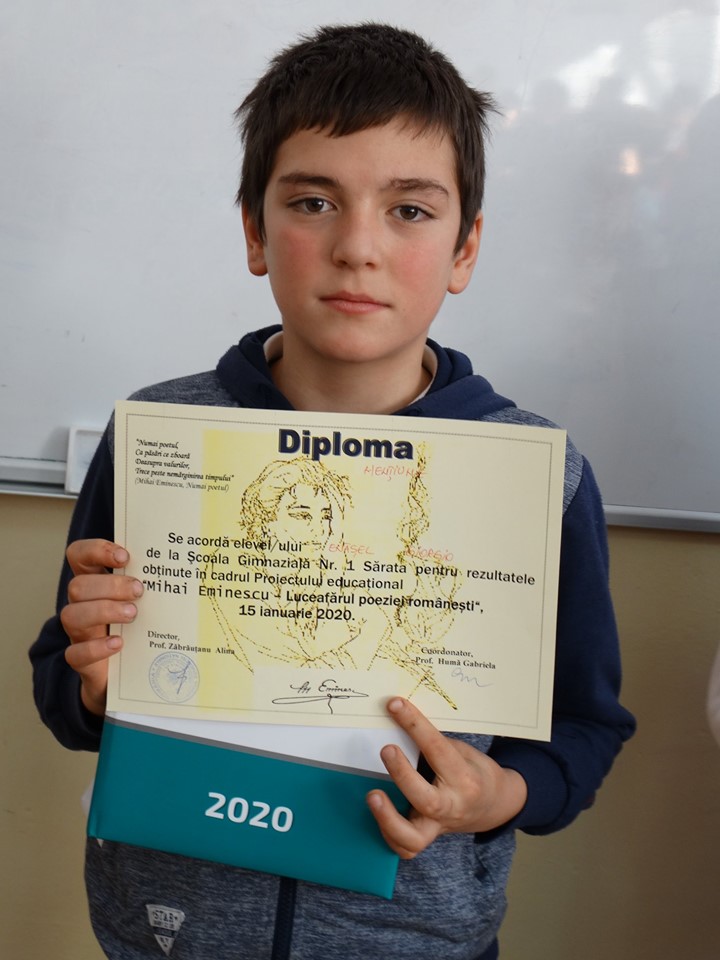În cadrul Proiectului desfăşurat cu ocazia împlinirii a 170 de ani de la naşterea poetului Mihai Eminescu s-a derulat şi un program ce a constat în organizarea unui concurs literar-artistic adresat elevilor claselor V-VIII, care au avut ocazia de a-şi face cunoscute talentele de expresivitate artistică din diferite domenii precum literatura, arta plastică şi educaţie muzicală. Activitatea a debutat cu recitarea poemului Luceafărul, ce a a avut ca scop demonstrarea denumirii de „Luceafăr al poeziei româneşti”, ce i-a fost atribuită poetului. Eminescu a fost mai aproape de noi când participanții la concurs au recitat cu vădită emoție Peste vârfuri…, Glossă, Doină, au cântat Pe lângă plopii fără soț, Mai am un singur dor. Toți cei prezenți am aflat că există oameni care ne fac să ne simțim o individualitate, care ne dovedesc că suntem de aici și nu de aiurea, ne determină să fim mândri că suntem români!