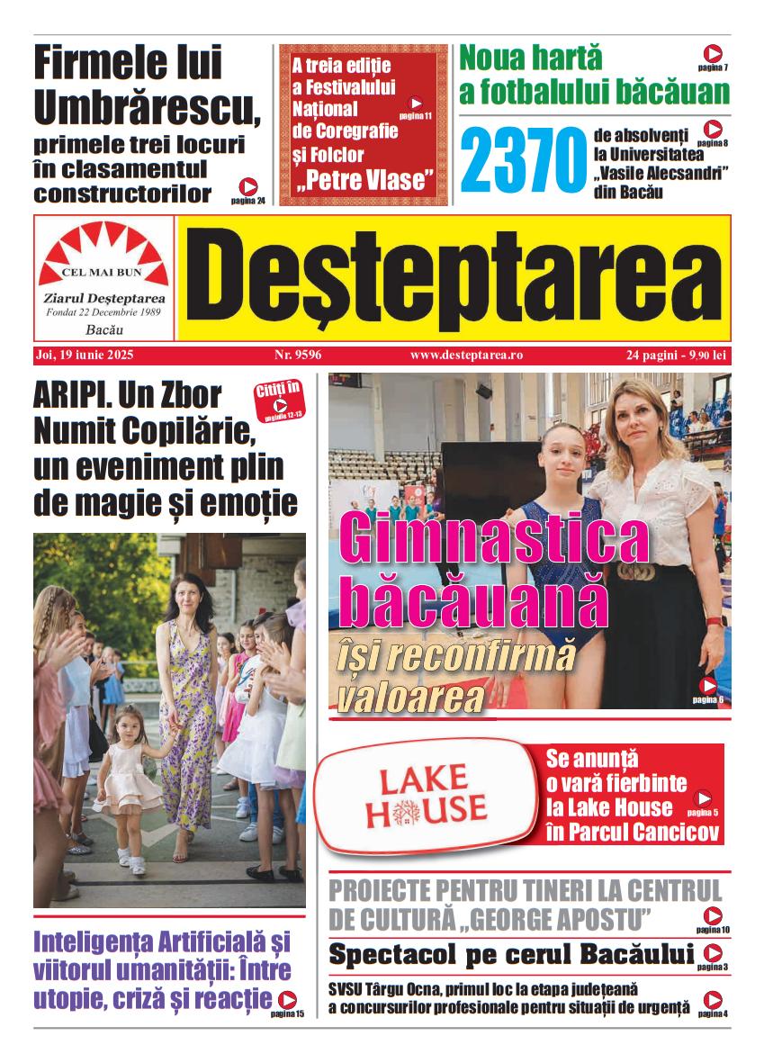 19 iunie 2025 Deșteptarea19 iunie 2025AcțiuneFacebookTwitterWhatsAppTelegramVK AcțiuneFacebookTwitterWhatsAppTelegramVK Rezultatele finale ale Concursului Interdisciplinar „Vrănceanu – Procopiu” Bacău, ediția a XXIV-a, 2025Fotbal: Ne-a părăsit Ioan Sdrobiș!Insula Misterioasă la balul Bobocilor de la Liceul Teoretic „Henri Coandă” BacăuZiua Internațională a Voluntariatului celebrată prin concurs de mediu la Palatul Copiilor BacăuU17 FC Viitorul Onești, calificare dramatică în optimile Cupei RomânieiObținerea permisului de conducere, mai simplă: cazierul judiciar este verificat direct la ghișeuAvertisment dur de la Garda de Mediu Bacău: un operator economic din Ardeoani, sancționat drastic pentru poluareJandarmii băcăuani i-au adus căldură lui Nea Vasile, 74 de aniFotbal/ Liga 3: Viitorul Onești câștigă, FC Bacău 2 încheie la egalitate un meci dramatic, iar Aerostar pierde acasăClubul Sportiv Bronx, rezultate remarcabile la competiția din Houlegate, FranțaConferința „Excelență, inovație și performanță în medicină” – un eveniment de referință pentru comunitatea medicală băcăuanăSub semnul recunoștinței și al binelui comun la hramul bisericii „Sfântul Nicolae” din Bacău