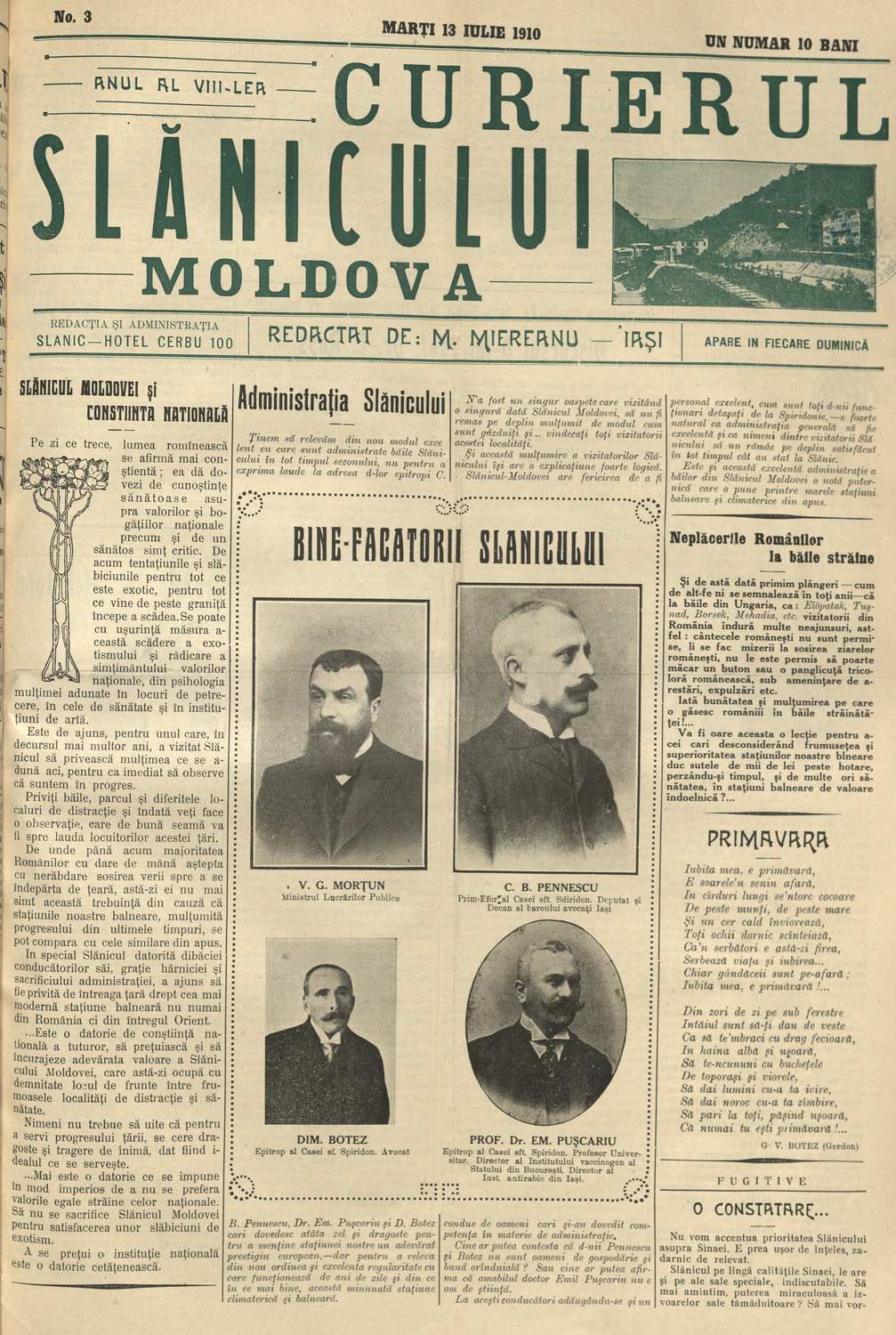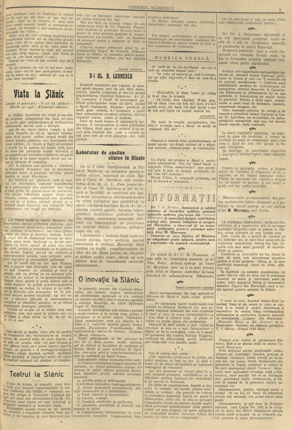 Printre informațiile cuprinse în acest număr, enumăr câteva: ministrul Vasile G. Morțun, după ce a primit numerele apărute până acum din ,,Curierul Slănicului”, a ținut să transmită mulțumiri pentru modul în care acest ziar contribuie la ,,înălțarea și progresul Slănicului”; într-o corespondență din Iași apărută în ziarul ,,Minerva”, de marți, 6 iulie 1910, citim printre altele că foarte mulți ieșeni și-au stabilit reședința de vară în această superbă stațiune, care, în urma îmbunătățirilor din ultima perioadă ar putea rivaliza cu multe altele din străinătate, mai ales că aici au început să ajungă tot mai mulți vizitatori străini, din țări ca Bulgaria, Austria, Rusia etc; la mulțimea distracțiilor și a mijloacelor de relaxare din Slănic se mai adaugă una: înființarea unei școli de scrimă, sub directa coordonare a maestrului Babeș din Iași, la Sala de cură a stațiunii; o nouă serie de îmbunătățiri se anunță a se realiza în stațiune: construirea unui stabiliment modern de hidroterapie în apropierea hotelului Racoviță, canalizarea stațiunii și alimentarea ei cu apă și construirea pe malul drept al râului Slănic, a două mari restaurante, aunui local de farmacie, băcănie, magazine; în această vară, printre distinșii vizitatori ai stațiunii s-a numărat și medicul-jurnalist Adolf Steuerman-Rodion (1872 – 1918), cazat împreună cu familia, la hotelul ,,Racoviță” și considerat de contemporanii săi ca fiind „unul dintre cei mai talentați gazetari, nu numai din Iași, ci din întreaga țară”. Medic de profesie, dar totodată și publicist „germanofil”, Adolf Steuerman-Rodion a participat la marea conflagrație din 1914 – 1918, ca doctor militar, dar și fidel reporter de război. Mobilizat pe Valea Cașinului în „clipa chemării naționale” – 15 august 1916 – medicul-publicist s-a remarcat printr-o atitudine exemplară, participând la întreaga campanie românească, până la retragerea armatei în Moldova. Puternic afectat de experiențele dramatice trăite pe front, dar și de nedreptățile etnice cu care s-a confruntat (problema naturalizării evreilor, a antisemitismului, cea a medicilor evrei în armată, care erau inegal tratați și retribuiți, sau cu cea a expulzării soldaților evrei din armată), maiorul Adolf Steuerman și-a pus capăt zilelor pe 21 septembrie 1918. Steuerman-Rodion a rămas în istoria presei și a culturii românești ca reprezentând imaginea intelectualului evreu, confruntat cu numeroase probleme etnice, ce se manifestau în România în primele decenii al secolului XX (cf. societatea evreiasca.ro – Irina Spirescu, la https://www.facebook.com/societateaevreiasca/photos/medicul-jurnalist-adolf-steuerman-rodion/474276789657262/).