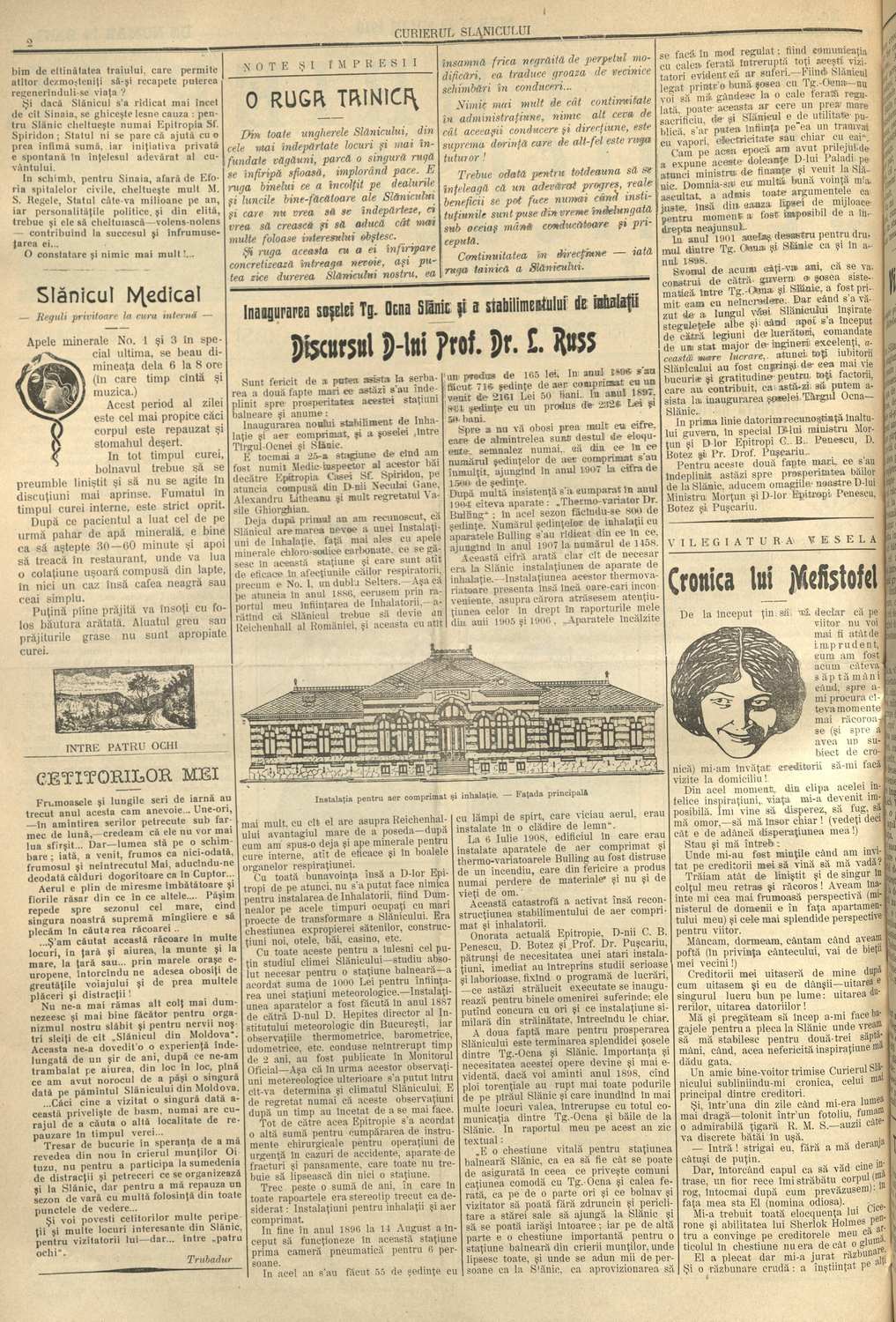 Ziua de 27 iunie 1910 va rămâne, fără îndoială, o dată de referință în istoria stațiunii Slănic-Moldova, care consfințește două mari realizări, deosebit de importante în planul dezvoltării și modernizării infrasctructurii turistice a localității: șoseaua care leagă stațiunea de restul țării și noul stabiliment de inhalații și aer comprimat, Inhalatorul, unul dintre cele mai moderne din Europa la acea dată. În episodul trecut am prezentat și redat câteva fragmente din discursul șefului epitropilor, C. B. Pennescu, iar în acest număr urmează cel al prof. dr. Ludovic Russ junior, medic-inspector al stațiunii și profesor de Clinică medicală la Facultatea de Medicină din Iași. În acest discurs, ca și în cazul celui rostit de epitropul Pennescu, apar informații și date în premieră, extraordinare pentru evoluția Slănicului Moldova: ,,E tocmai a 25-a stagiune de când am fost numit medic-inspector al acestor Băi, de către Epitropia `Casei Sf. Spiridon`, pe atunci compusă din domnii Nicolae Gane (scriitor și om politic, prieten al Slănicului, n. a.), Alexandru Vârnav Liteanu (pentru contribuția adusă de către acesta la ridicarea Băilor Slănic, unul dintre izvoarele minerale i-a purtat numele, n. a) și mult regretatul Vasile Ghiorghian (om politic, ministru al Agriculturii, Domeniilor, Comrețului și Industriei în cabinetul lui I. C. Brătianu și prefect al județului Iași, n. a.). Deja după primul an am recunoscut că, Slănicul are mare nevoie de o instalație de inhalație, mai ales că, apele minerale cloro-sodice carbonate care se găsesc în această stațiune sunt atât de eficace în afecțiunile căilor respiratorii, precum e Izvorul Nr. 1, un dublu Selters (adică de două ori mai valoros față de apa minerală de renume mondial Selters din Germania, n. a.). Așa că, pe-atunci, în 1886, cerusem prin raportul meu, înființarea unui inhalator mai mare și mai dotat – arătând că Slănicul trebuie să devină un Bad Reichenhall al României și aceasta cu atât mai mult, cu cât el are asupra Reichenhall-ului, marele avantaj – așa cum am mai arătat – de a poseda și ape minerale pentru cure interne, atât de indicate și în bolile organelor respiratorii”.
