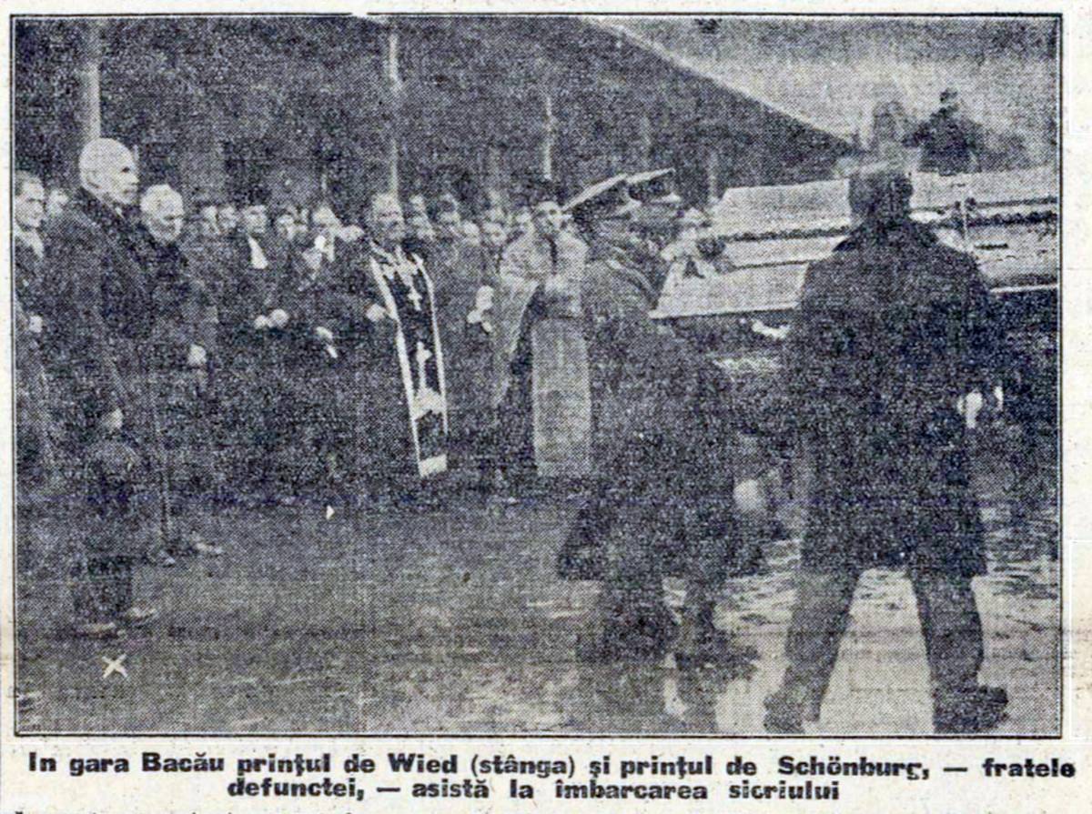 Joi dimineață, rămășițele pământești ale principesei au fost transportate la gara Bacău, de unde urmau să fie duse în Germania, la Lichtenstein, unde se afla cavoul familiei ei. La ora 9 dimineața, un preot protestant a oficiat o slujbă religioasă. Prezenți la ceremonie erau prințul de Wied, prințul de Schönburg-Walburg și câțiva cunoscuți. Sicriul metalic fusese sigilat. În jurul lui, în sufrageria simplă de la parter, învăluită în întuneric și rece, florile și jerbele își răspândeau parfumul. La ușă, câteva femei bătrâne din sat plângeau. În afara clădirii, în frigul aspru, locuitorii satului și țăranii așteptau, iar mașina funerară adusă din București îi aștepta. Era o vreme îngrozitor de friguroasă. Sicriul a fost purtat pe umeri de o echipă de jandarmi rurali și introdus în dricul fără cai. Preotul satului a evidențiat meritele defunctei într-un scurt discurs, iar copiii au intonat „Doamne, miluiește“, în timp ce câțiva bătrâni țărani, îngenunchiați și în lacrimi, își sărutau mâinile palide ale prințului de Wied, care urcase în mașină. Un om a scos rapid draperiile negre de la intrare. Cortegiul format din puține vehicule s-a îndreptat spre gara Bacău, pe o șosea noroioasă. Acolo, sicriul metalic a fost ridicat pe umeri de o echipă de servanți ai orașului și introdus în vagonul mortuar. Pe peron, oficialități locale, ofițeri și călători s-au strâns pentru a asista la o scurtă slujbă divină, după care ușa vagonului a fost sigilată. Prințul de Wied însoțea rămășițele pământești ale soției sale până în Germania. La ora 6 seara, vagonul a fost atașat la trenul accelerat.