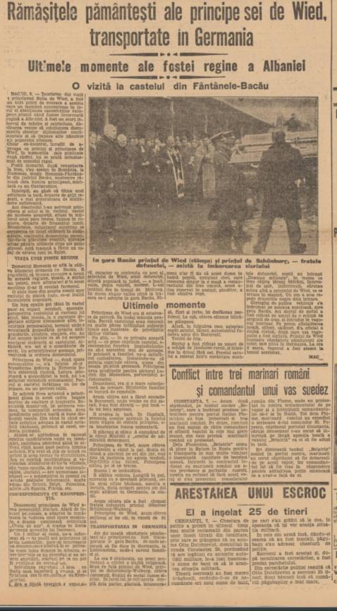 BACĂU, 6. — Încetarea din viață a principesei Sofia de Wied a fost un prilej trist de evocare a unei figuri care, pentru un scurt timp, a captat atenția cancelariilor europene, atunci când a fost încoronată regină a Albaniei. A fost un scurt interval de glorie și celebritate. Abdicarea sa a venit pentru a soluționa disensiunile dintre sferele diplomatice continentale și pentru a îmblânzi alte aspirații ale poporului albanez. Chiar și fostul împărat, înrudit apropiat cu prințul și principesa de Wied, în memoriile sale publicate după război, nu a exprimat entuziasmul pentru această perioadă regală. După abdicare, foștii monarhi s-au stabilit în România, la frumoasa moșie Hemeiuș-Fântânele din județul Bacău, o moștenire rămasă de la bunica principesei, care s-a căsătorit cu un Cantacuzino. Aici, departe de griji regale, au găsit liniștea unei vieți la țară, care le-a adus mai multă satisfacție sufletească. Anii au trecut, iar principesa și soțul ei au petrecut mult timp în vechiul castel de proporții modeste, situat în mijlocul unui parc imens, faimos în regiune, departe de agitația lumii. Desigur, voluntarul lor exil s-a compensat cu lungi călătorii în străinătate, veniturile domeniului permițându-le să se bucure de plăcerile călătoriilor, aproape până în ultimele clipe ale principesei. În această toamnă, a făcut o călătorie de câteva săptămâni în Egipt.