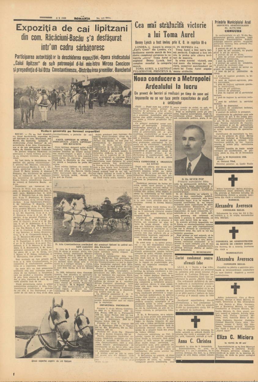 BACAU. — Cu un fast deosebit s-a făcut deschiderea expoziţiei de cai lipizani în соm. Răcăciuni, jud. Bacău, din lăudabila iniţiativă a sindicatului „Calul lipitzan“ de sub preşedinţia d-lui Atta Constantinescu şi de sub patronajul d-lui ministru de finanţe Mircea Cancicov. Pe platoul târgului Răcăciuni s-a amenajat o vastă tribună pavoazată cu steaguri tricolore, pentru invitaţi. Au luat parte la deschiderea expoziţiei din partea oficialităţilor : d. general Gh. Manoliu, comandantul garnizoanei Bacău, d. col. I. Minescu, prefectul judeţului, d. col. Const. F. Bellu, primar, d. director Romano, din ministerul de agricultură, d. inspector dr. A. Goreniuc, din ministerul de agricultură, d. Eugen Iliescu, preşedintele Camerei de comerţ şi Industrie Bacău cu d-na.