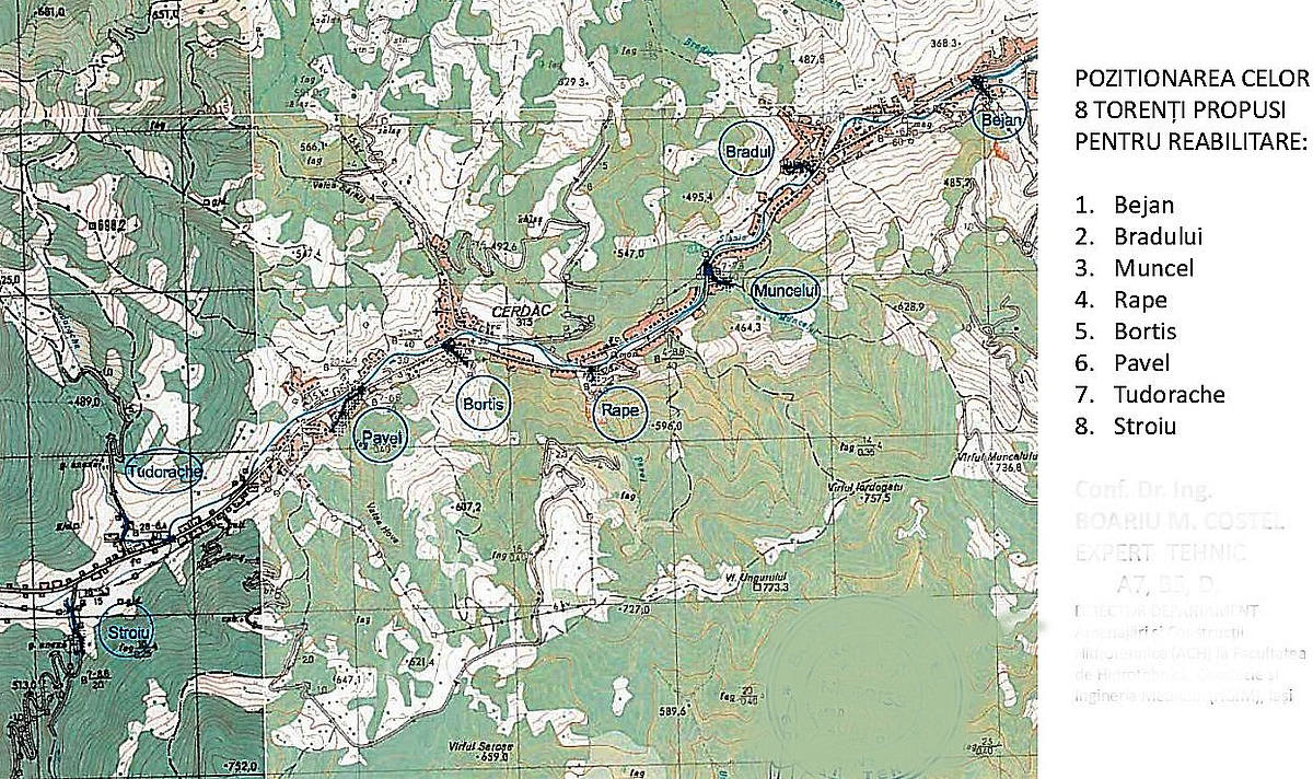 Vor fi reabilitați torenții din Cireșoaia, de pe străzile Bradului, Zefirului și Arieșului, cu o suprafață totală de 8.977 mp; torenții din cartierul Cerdac, de pe strada 1 Mai (pârâul Pavel și pârâul Rape) și strada Crângului, cu o suprafață totală de 5.619 mp; precum și torenții din Slănic Moldova, de pe străzile Sărăriei și Primăverii, cu o suprafață totală de 8.927 mp. În total, vor fi 24 de amplasamente, cu o suprafață de 25.523 mp.