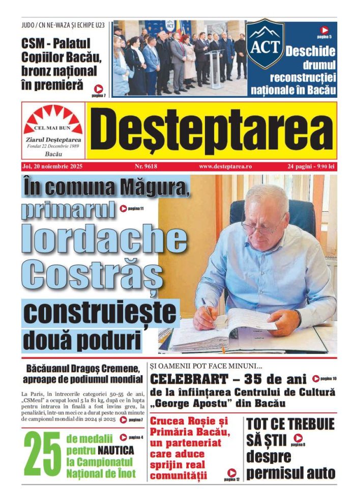 20 noiembrie 2025 Deșteptarea20 noiembrie 2025AcțiuneFacebookTwitterWhatsAppTelegramVK AcțiuneFacebookTwitterWhatsAppTelegramVK Jandarmii băcăuani i-au adus căldură lui Nea Vasile, 74 de aniFotbal/ Liga 3: Viitorul Onești câștigă, FC Bacău 2 încheie la egalitate un meci dramatic, iar Aerostar pierde acasăClubul Sportiv Bronx, rezultate remarcabile la competiția din Houlegate, FranțaConferința „Excelență, inovație și performanță în medicină” – un eveniment de referință pentru comunitatea medicală băcăuanăSub semnul recunoștinței și al binelui comun la hramul bisericii „Sfântul Nicolae” din BacăuElevi ai Liceului Tehnologic Târgu Ocna, în recital la „Sunetul colindelor în inima muntelui de sare”Spitalul din Buhuși va deschide în 2026 un program de chirurgie robotică – un pas major pentru medicina din nord-estul țăriiCând Cel Drept vindecă gârbovirea celei smerite (Luca 13, 10- 17)Duminica a II din AdventAcțiunea Conservatoare Bacău a constituit organizația locală OneștiInformare privind cele mai bune practici de utilizare a produselor biocide Decembrie 2025Moș Nicolae a venit și la copiii internați la „Pediatrie”