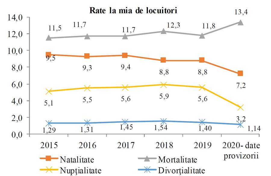 În ultimii șase ani, rata mortalității a fost sub 12 decedați la mia de locuitori, cu excepția anului 2018, când s-a înregistrat o rată de 12,3 la mie. Rata crescută a mortalității din 2020 este explicată parțial de numărul deceselor puse pe seama COVID 19.