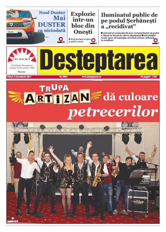 Deșteptarea 8 decembrie 2017 Acțiune FacebookTwitterWhatsAppTelegramVK Acțiune FacebookTwitterWhatsAppTelegramVK Jandarmii băcăuani i-au adus căldură lui Nea Vasile, 74 de ani Fotbal/ Liga 3: Viitorul Onești câștigă, FC Bacău 2 încheie la egalitate un meci dramatic, iar Aerostar pierde acasă Clubul Sportiv Bronx, rezultate remarcabile la competiția din Houlegate, Franța Conferința „Excelență, inovație și performanță în medicină” – un eveniment de referință pentru comunitatea medicală băcăuană Sub semnul recunoștinței și al binelui comun la hramul bisericii „Sfântul Nicolae” din Bacău Elevi ai Liceului Tehnologic Târgu Ocna, în recital la „Sunetul colindelor în inima muntelui de sare” Spitalul din Buhuși va deschide în 2026 un program de chirurgie robotică – un pas major pentru medicina din nord-estul țării Când Cel Drept vindecă gârbovirea celei smerite (Luca 13, 10- 17) Duminica a II din Advent Acțiunea Conservatoare Bacău a constituit organizația locală Onești Informare privind cele mai bune practici de utilizare a produselor biocide Decembrie 2025 Moș Nicolae a venit și la copiii internați la „Pediatrie”