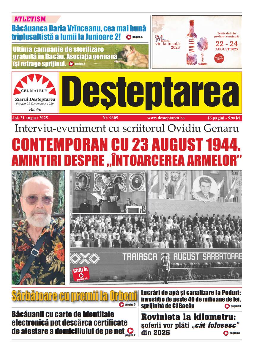 21 august 2025 Deșteptarea21 august 2025AcțiuneFacebookTwitterWhatsAppTelegramVK AcțiuneFacebookTwitterWhatsAppTelegramVK Insula Misterioasă la balul Bobocilor de la Liceul Teoretic „Henri Coandă” BacăuZiua Internațională a Voluntariatului celebrată prin concurs de mediu la Palatul Copiilor BacăuU17 FC Viitorul Onești, calificare dramatică în optimile Cupei RomânieiObținerea permisului de conducere, mai simplă: cazierul judiciar este verificat direct la ghișeuAvertisment dur de la Garda de Mediu Bacău: un operator economic din Ardeoani, sancționat drastic pentru poluareJandarmii băcăuani i-au adus căldură lui Nea Vasile, 74 de aniFotbal/ Liga 3: Viitorul Onești câștigă, FC Bacău 2 încheie la egalitate un meci dramatic, iar Aerostar pierde acasăClubul Sportiv Bronx, rezultate remarcabile la competiția din Houlegate, FranțaConferința „Excelență, inovație și performanță în medicină” – un eveniment de referință pentru comunitatea medicală băcăuanăSub semnul recunoștinței și al binelui comun la hramul bisericii „Sfântul Nicolae” din BacăuElevi ai Liceului Tehnologic Târgu Ocna, în recital la „Sunetul colindelor în inima muntelui de sare”Spitalul din Buhuși va deschide în 2026 un program de chirurgie robotică – un pas major pentru medicina din nord-estul țării