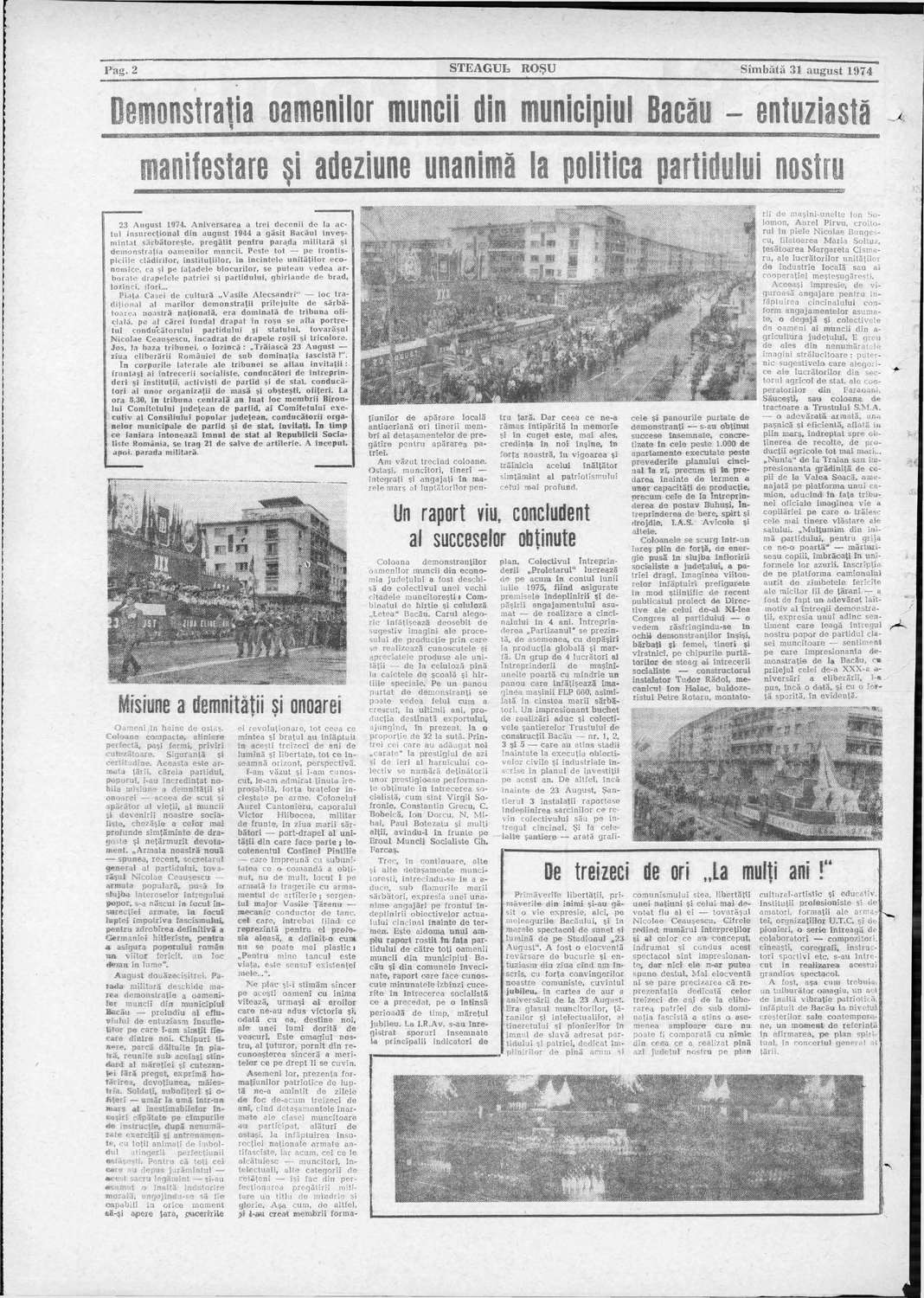 23 August 1974. Aniversarea a trei decenii de la actul insurecțional din august 1944 a găsit Bacăul înveșmântat sărbătorește, pregătit pentru parada militară șidemonstrația oamenilor muncii. Peste tot — pe frontispiciile clădirilor, instituțiilor, în incintele unităților economice, ca și pe fațadele blocurilor, se puteau vedea arborate drapelele patriei și partidului, ghirlande de brad, lozinci, flori…