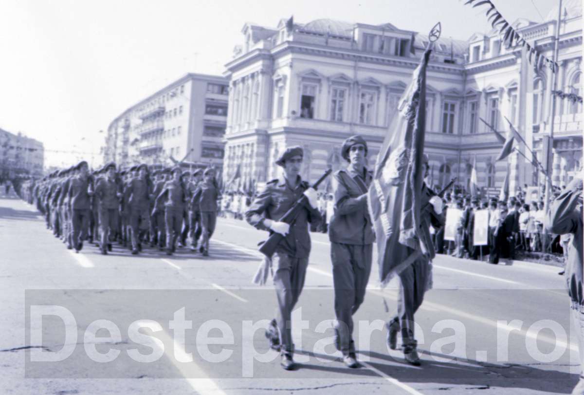 La ora 8,30, în tribuna centrală au luat loc membrii Biroului Comitetului județean de partid, ai Comitetului executiv al Consiliului popular județean, conducătorii organelor municipale de partid și de stat, invitați. în timp ce fanfara intonează Imnul de stat al Republicii Socialiste România, se trag 21 de salve de artilerie. A început, apoi, parada militară.