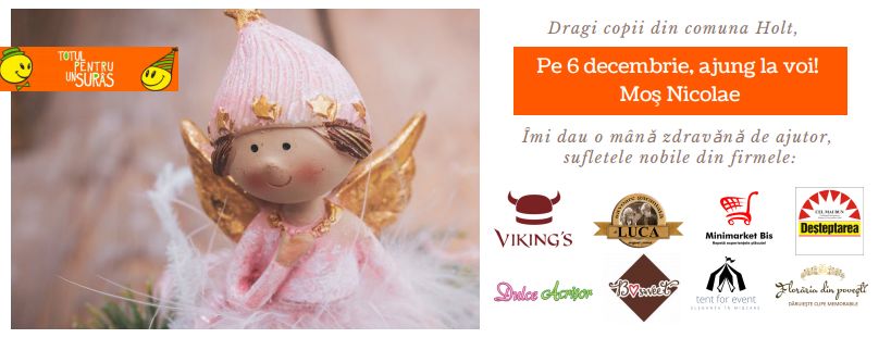 De Moș Nicolae, cei 23 copii care provin din familii nevoiașe, de care are grijă preotul Adam Iulian, din satul Holt, comuna Letea Veche, județul Bacău, vor primi vizita lui Moș Nicolae. Asociația „Totul pentru un surâs”, reprezentată de Tania-Loredana Diaconu, a adunat o mână de oameni tare buni, care cu bunăvoință și empatie, vor dărui copiilor: fursecuri delicioase, dulciuri, sucuri, fructe, baloane tematice, tort, burgeri și cartofi delicioși.