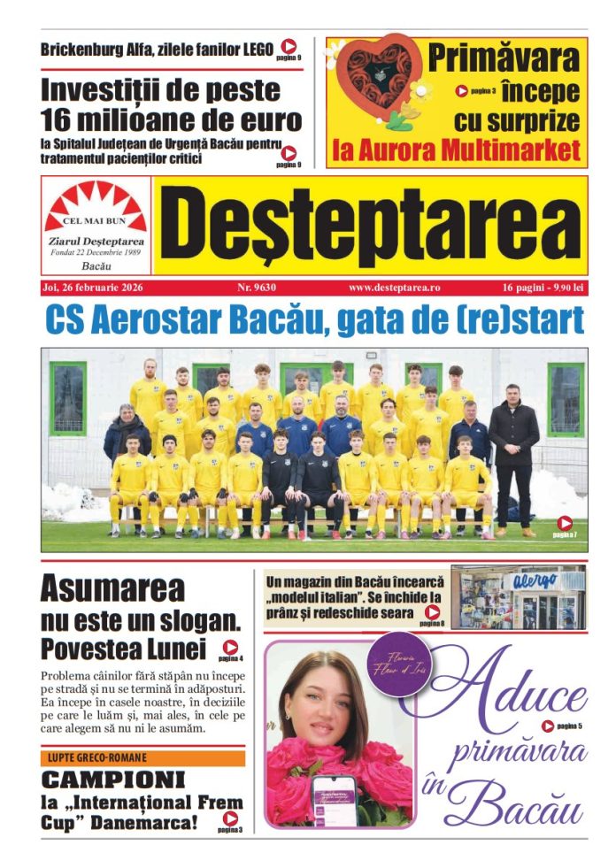 26 februarie 2026 Deșteptarea26 februarie 2026AcțiuneFacebookTwitterWhatsAppTelegramVK AcțiuneFacebookTwitterWhatsAppTelegramVK Semafoarele din mai multe intersecții au fost puse în funcțiune simultan; traficul a fost îngreunatPolițiștii recomandă prudență în trafic, în contextul ploii, lapoviței și ninsoriiGala Recunoștinței și modestia celor care le datorăm recunoștințăFoame de bani la buget: Guvernul taie posturi în administrație și permite executarea indemnizațiilor pentru persoanele cu handicap gravTenis/ Circuitul Național FRT: Trofeul „Ciuntea Tennis Center” U14 și-a desemnat câștigătoriiBărbat arestat preventiv după ce ar fi înjunghiat două persoane într-un imobil din BuhușiBacău: A început pregătirea Seriei a XXV-a de voluntari în programul „Salvator din pasiune”Lupte greco-romane: Campioni la „Internațional Frem Cup” Danemarca !Cazul bebelușului răpit din maternitatea din Bacău: testul poligraf reaprinde ancheta la aproape un an de la incidentInstitutul Național de Statistică: peste 52.000 de salariați dispăruți din economie în 2025; Cristian Socol vorbește despre recesiuneActivitate de prevenire pentru copiii din sistemul de protecție, organizată de polițiștiExerciții de evacuare în caz de cutremur, organizate în județul Bacău de Ziua Protecției Civile