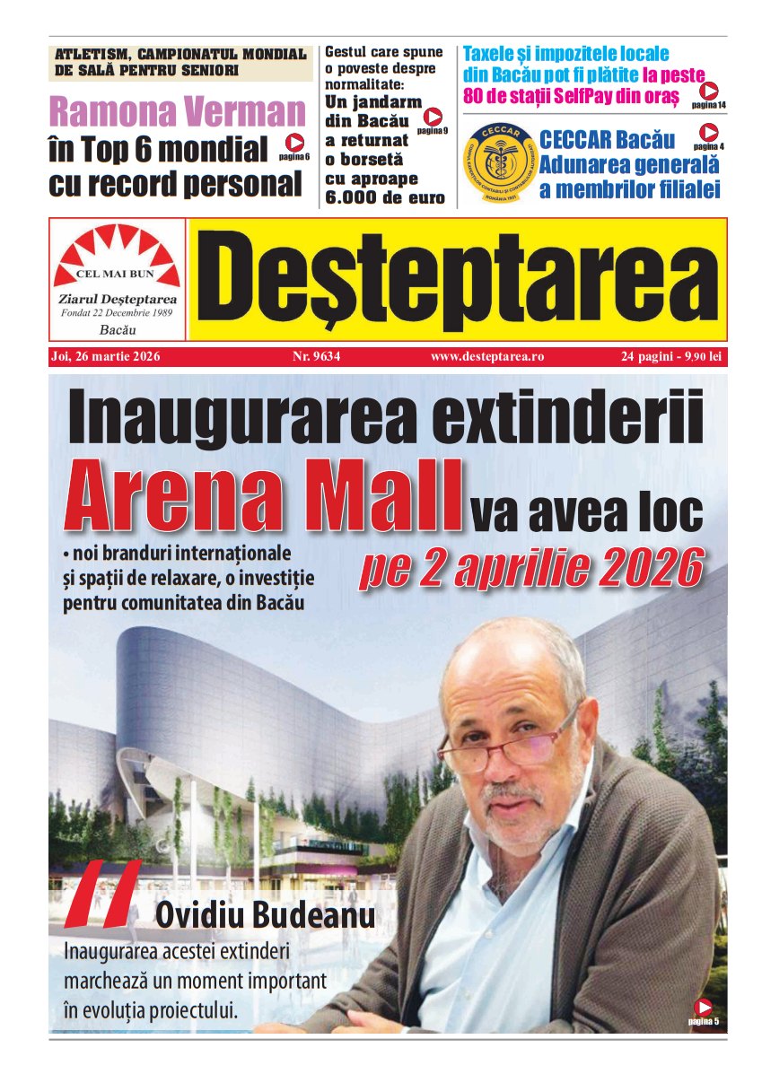 26 martie 2026 Deșteptarea26 martie 2026AcțiuneFacebookTwitterWhatsAppTelegramVK AcțiuneFacebookTwitterWhatsAppTelegramVK România trece la ora de vară în noaptea de 28 spre 29 martie. Ceasurile se dau înainte cu o orăConvocarea Adunărilor generale extraordinară și ordinară ale acționarilor în 29/30 aprilie 2026C O N V O C A T O RAutostrada Moldovei A7 prinde contur: se asfaltează la Nodul Rutier Bacău Nord (Bacău–Roman)CECCAR Bacău: Adunarea generala a membrilor filialei„Bacău Blue Zone”Reușite de bronz pentru CSM și CSȘ BacăuPolițiștii de siguranță școlară, alături de elevii din GhilăveștiABA Siret: exploatare ilegală de agregate descoperită în terasa râului Siret, la BuhociExplozie urmată de incendiu într-un apartament din Bacău: 22 de persoane evacuate, două au primit îngrijiri medicaleCât costă produsele din piețele băcăuane: comparație între Bacău, Moinești, Onești și BuhușiDin Mănăstirea Cașin pe scena europeană: Ionela Zota, finalistă la Miss Regina d’Europa