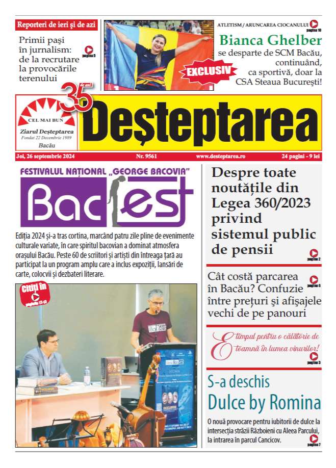 26 septembrie 2024 Deșteptarea26 septembrie 2024AcțiuneFacebookTwitterWhatsAppTelegramVK AcțiuneFacebookTwitterWhatsAppTelegramVK Rezultatele finale ale Concursului Interdisciplinar „Vrănceanu – Procopiu” Bacău, ediția a XXIV-a, 2025Fotbal: Ne-a părăsit Ioan Sdrobiș!Insula Misterioasă la balul Bobocilor de la Liceul Teoretic „Henri Coandă” BacăuZiua Internațională a Voluntariatului celebrată prin concurs de mediu la Palatul Copiilor BacăuU17 FC Viitorul Onești, calificare dramatică în optimile Cupei RomânieiObținerea permisului de conducere, mai simplă: cazierul judiciar este verificat direct la ghișeuAvertisment dur de la Garda de Mediu Bacău: un operator economic din Ardeoani, sancționat drastic pentru poluareJandarmii băcăuani i-au adus căldură lui Nea Vasile, 74 de aniFotbal/ Liga 3: Viitorul Onești câștigă, FC Bacău 2 încheie la egalitate un meci dramatic, iar Aerostar pierde acasăClubul Sportiv Bronx, rezultate remarcabile la competiția din Houlegate, FranțaConferința „Excelență, inovație și performanță în medicină” – un eveniment de referință pentru comunitatea medicală băcăuanăSub semnul recunoștinței și al binelui comun la hramul bisericii „Sfântul Nicolae” din Bacău