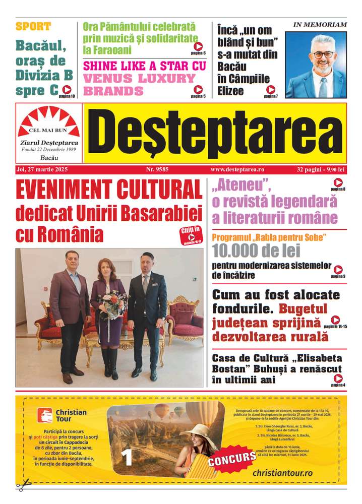 27 martie 2025 Deșteptarea27 martie 2025AcțiuneFacebookTwitterWhatsAppTelegramVK AcțiuneFacebookTwitterWhatsAppTelegramVK Intervenție laparoscopică reușită pentru tratarea infertilității cauzate de varicocel40 de kilograme de articole pirotehnice, deținute ilegal, descoperite de polițiștii băcăuaniCând se organizează Alaiul Datinilor și Obiceiurilor de Iarnă în BacăuTrei cazuri noi de gripă și peste 1.500 de infecții respiratorii în județul BacăuConcursul Național Interdisciplinar „Vrănceanu – Procopiu” Bacău, ediția a XXIV-a, 2025Cum transformă perdelele atmosfera din orice locuință„Once Upon a Ball – Povestea Bobocilor” de la Liceul „Borcea” BuhușiPrimarul Lucian-Daniel Stanciu-Viziteu: „Vom continua și anul viitor dezvoltarea municipiului Bacău prin investiții”Sărbătoare în inima Bacăului: Hramul „Sfântul Nicolae” și 20 de ani de la sfințirea bisericii „Sfinții Petru și Paul”O lege mută elevii de clasa a VIII-a exclusiv în programul de dimineațăWDSF Bacău Dance Open 2025 – Un spectacol de pasiune și eleganță pe ringul de dansInspectoratul de Jandarmi Județean „Ștefan cel Mare” Bacău, distins cu Placheta de Onoare a Ministerului Afacerilor Interne