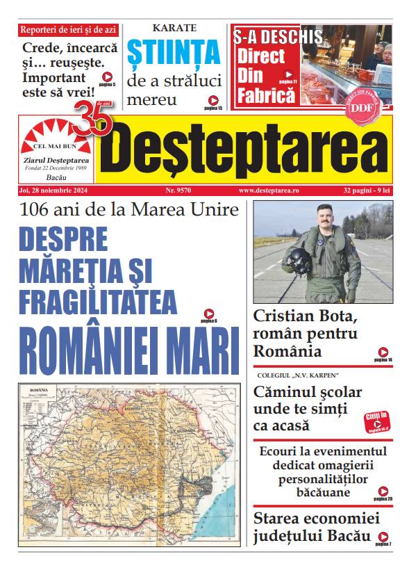28 noiembrie 2024 Deșteptarea28 noiembrie 2024AcțiuneFacebookTwitterWhatsAppTelegramVK AcțiuneFacebookTwitterWhatsAppTelegramVK Rezultatele finale ale Concursului Interdisciplinar „Vrănceanu – Procopiu” Bacău, ediția a XXIV-a, 2025Fotbal: Ne-a părăsit Ioan Sdrobiș!Insula Misterioasă la balul Bobocilor de la Liceul Teoretic „Henri Coandă” BacăuZiua Internațională a Voluntariatului celebrată prin concurs de mediu la Palatul Copiilor BacăuU17 FC Viitorul Onești, calificare dramatică în optimile Cupei RomânieiObținerea permisului de conducere, mai simplă: cazierul judiciar este verificat direct la ghișeuAvertisment dur de la Garda de Mediu Bacău: un operator economic din Ardeoani, sancționat drastic pentru poluareJandarmii băcăuani i-au adus căldură lui Nea Vasile, 74 de aniFotbal/ Liga 3: Viitorul Onești câștigă, FC Bacău 2 încheie la egalitate un meci dramatic, iar Aerostar pierde acasăClubul Sportiv Bronx, rezultate remarcabile la competiția din Houlegate, FranțaConferința „Excelență, inovație și performanță în medicină” – un eveniment de referință pentru comunitatea medicală băcăuanăSub semnul recunoștinței și al binelui comun la hramul bisericii „Sfântul Nicolae” din Bacău