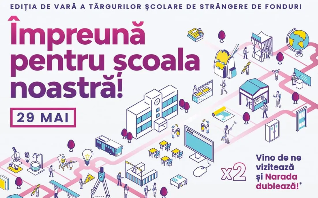Pe 29 mai, în cadrul târgurilor organizate în fiecare școală, unitățile de învățământ mobilizează comunitățile pentru a participa și a cumpăra produsele puse în vânzare. Banii adunați vor fi și de această data supuși unui mecanism de dublare, susținut de partenerii Narada, Bergerat Monnoyeour și Ipso Agricultură, și vor fi folosiți pentru finanțarea unor alerte de tipul schimbarea pardoselii și a acoperișului într-o școală, instalarea unui sistem de securitate, reabilitatea instalației electrice, construirea unui teren de sport sau a unor spații de învățare și de joacă pentru copii.