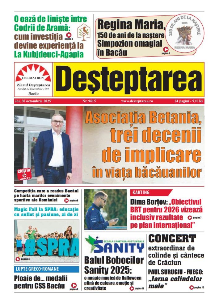 30 octombrie 2025 Deșteptarea30 octombrie 2025AcțiuneFacebookTwitterWhatsAppTelegramVK AcțiuneFacebookTwitterWhatsAppTelegramVK Avertisment dur de la Garda de Mediu Bacău: un operator economic din Ardeoani, sancționat drastic pentru poluareJandarmii băcăuani i-au adus căldură lui Nea Vasile, 74 de aniFotbal/ Liga 3: Viitorul Onești câștigă, FC Bacău 2 încheie la egalitate un meci dramatic, iar Aerostar pierde acasăClubul Sportiv Bronx, rezultate remarcabile la competiția din Houlegate, FranțaConferința „Excelență, inovație și performanță în medicină” – un eveniment de referință pentru comunitatea medicală băcăuanăSub semnul recunoștinței și al binelui comun la hramul bisericii „Sfântul Nicolae” din BacăuElevi ai Liceului Tehnologic Târgu Ocna, în recital la „Sunetul colindelor în inima muntelui de sare”Spitalul din Buhuși va deschide în 2026 un program de chirurgie robotică – un pas major pentru medicina din nord-estul țăriiCând Cel Drept vindecă gârbovirea celei smerite (Luca 13, 10- 17)Duminica a II din AdventAcțiunea Conservatoare Bacău a constituit organizația locală OneștiInformare privind cele mai bune practici de utilizare a produselor biocide Decembrie 2025