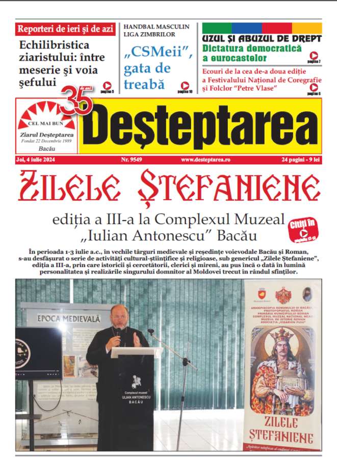 4 iulie 2024 Deșteptarea4 iulie 2024AcțiuneFacebookTwitterWhatsAppTelegramVK AcțiuneFacebookTwitterWhatsAppTelegramVK Peste 30 de intervenții gestionate de pompierii băcăuani în acest weekendRezultatele finale ale Concursului Interdisciplinar „Vrănceanu – Procopiu” Bacău, ediția a XXIV-a, 2025Fotbal: Ne-a părăsit Ioan Sdrobiș!Insula Misterioasă la balul Bobocilor de la Liceul Teoretic „Henri Coandă” BacăuZiua Internațională a Voluntariatului celebrată prin concurs de mediu la Palatul Copiilor BacăuU17 FC Viitorul Onești, calificare dramatică în optimile Cupei RomânieiObținerea permisului de conducere, mai simplă: cazierul judiciar este verificat direct la ghișeuAvertisment dur de la Garda de Mediu Bacău: un operator economic din Ardeoani, sancționat drastic pentru poluareJandarmii băcăuani i-au adus căldură lui Nea Vasile, 74 de aniFotbal/ Liga 3: Viitorul Onești câștigă, FC Bacău 2 încheie la egalitate un meci dramatic, iar Aerostar pierde acasăClubul Sportiv Bronx, rezultate remarcabile la competiția din Houlegate, FranțaConferința „Excelență, inovație și performanță în medicină” – un eveniment de referință pentru comunitatea medicală băcăuană