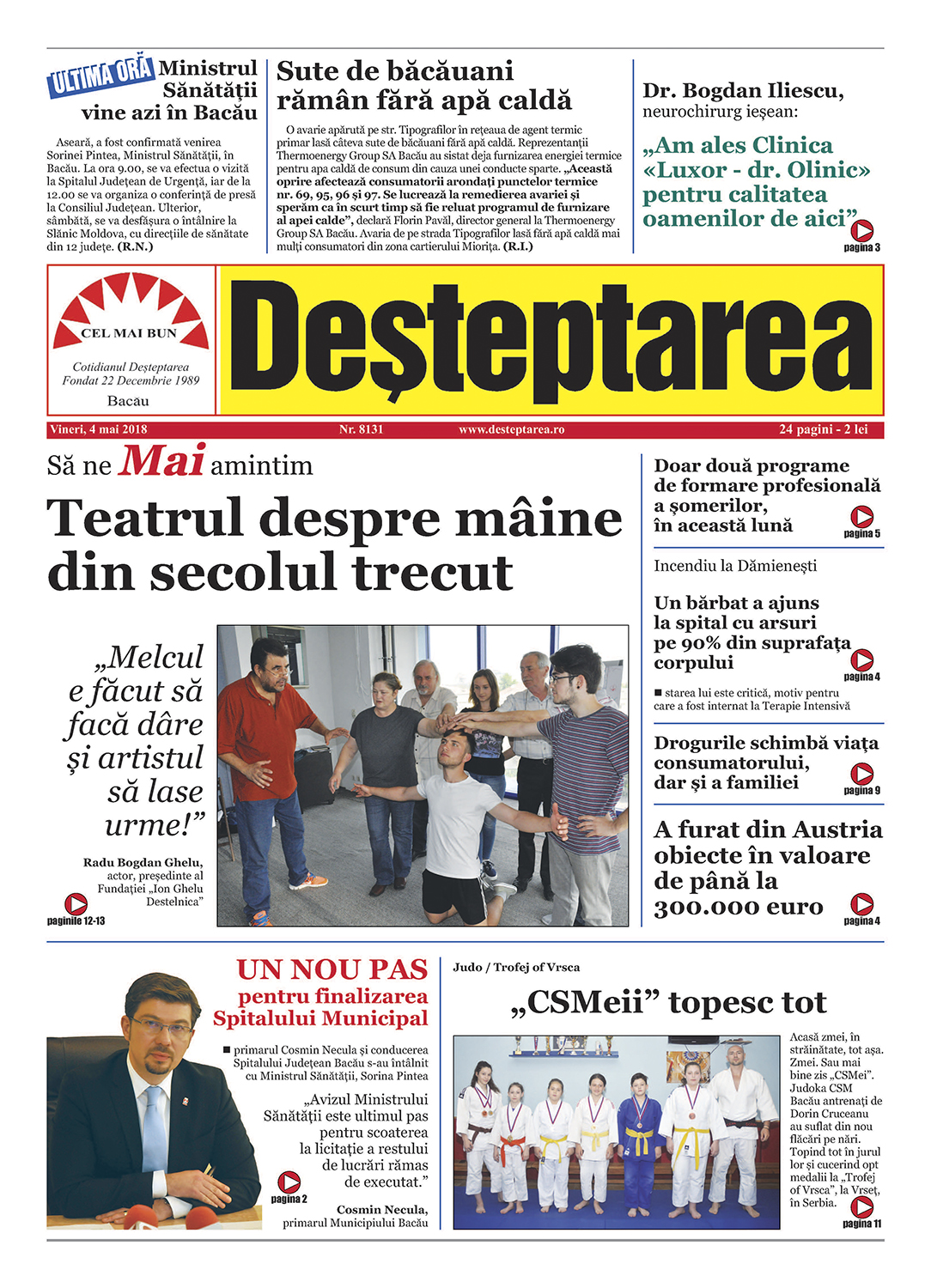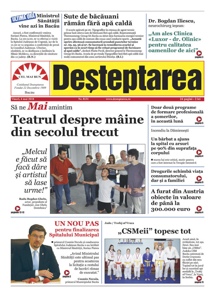 4 mai 2018 Deșteptarea 4 mai 2018 Acțiune FacebookTwitterWhatsAppTelegramVK Acțiune FacebookTwitterWhatsAppTelegramVK Fotbal/ Liga 2: FC Bacău o spulberă cu 5-1 pe Ceahlăul în deplasare și încheie anul în forță! A7 Moldova: Lucrări avansate la trecerea Berești-Sascut, aproape de finalizare „Retorta de argint” și alte lumi dispărute: amintiri despre festivalurile muncitorești Bacăul accelerează în topul salarial al Moldovei: industria trage județul înainte Box: ACS Dan Gym Box, clubul de bronz cu oameni de aur Guvernul limitează cantitățile de alcool și tutun pentru uz personal: maximum 10 litri de băuturi spirtoase Scos din trafic de polițiștii rutieri și introdus în arest Exercițiu de evacuare și prim ajutor la Spitalul Județean de Urgență Bacău, simulând un cutremur în zona Vrancea Spitalul „Prof. Dr. Eduard Apetrei” Buhuși deschide dialogul cu pacienții, într-o întâlnire programată pe 23 decembrie Două dintre cele mai valoroase companii din România sunt din Bacău, conform Ziarului Financiar Bacău: Universitatea „Vasile Alecsandri” a organizat serbarea de Crăciun Dublă lansare de carte la Centrul de Cultură „George Apostu”, cu Carmen Mihalache și Dan Perșa