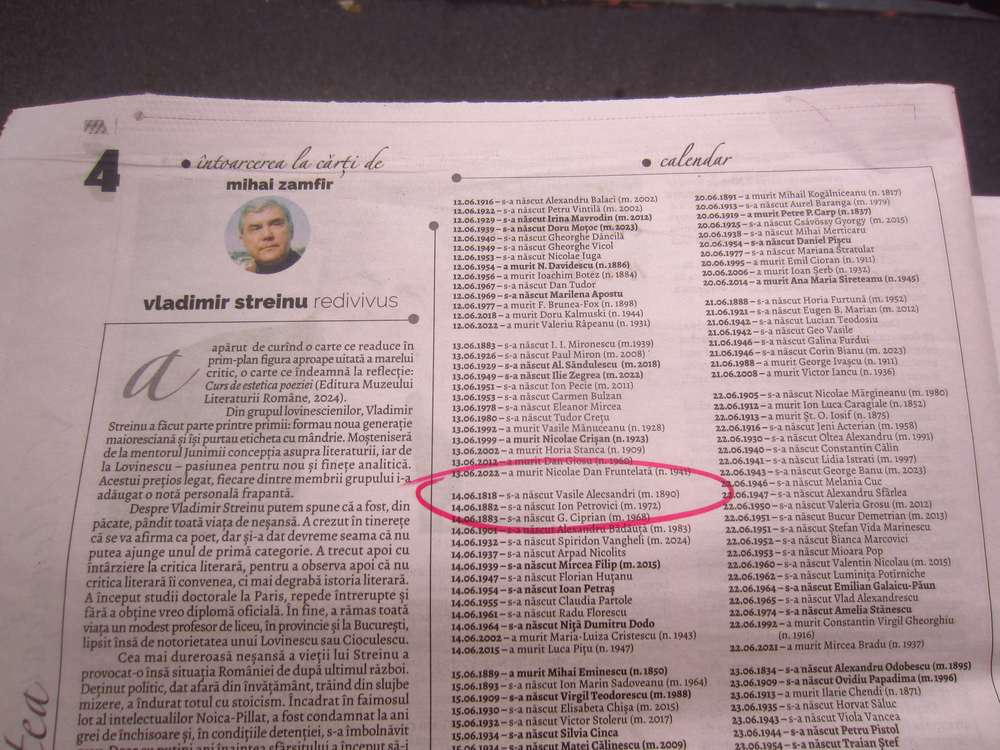 DIN ROMÂNIA LITERARĂNumărul 27 (din 28 iunie a.c.) al revistei Uniunii Scriitorilor din România publică, conform tradiţiei de decenii, data reală a naşterii lui Vasile Alecsandri: 14 iunie 1818.