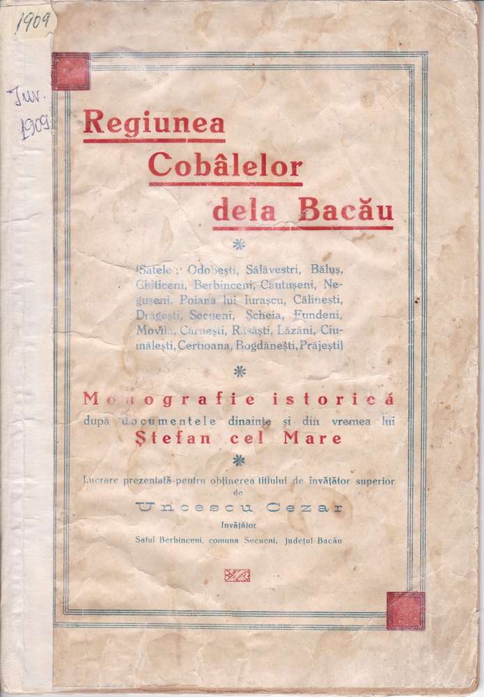 …ŞI DIN 1934. În acest an, Cezar Uncescu, din Berbinceni, comuna Secuieni, a tipărit lucrarea „Regiunea cobâlelor de la Bacău”, pentru obţinerea titlului de învăţător superior, aflată în fondul de carte al Bibliotecii Complexului Muzeal „Iulian Antonescu” din Bacău. Am cercetat-o chiar de 2 iulie, fiind, după subtitlu, o „monografie istorică după documentele dinainte şi din vremea lui Ştefan cel Mare”.