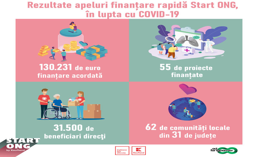 În total, la nivel național, 55 de proiecte, în valoare totală de 130.000 de euro, finanțate în cadrul apelurilor din lunile aprilie și mai ale programului Start ONG, lansat de Kaufland România și implementat de asociația Act for Tomorrow, au ajutat în mod direct 31.500 persoane pentru a trece mai ușor peste efectele negative cauzate de COVID-19.