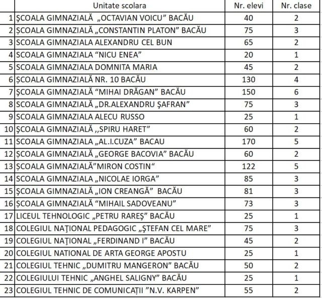 Clasele pregătitoare din 23 de școli, licee și colegii, din municipiul Bacău, în care cei mai mici elevi vor descoperi tainele cifrelor și ale tehnicii, dar și farmecul literelor, sunt dotate cu table magnetice, calculatoare și videoproiectoare și mobilier modern, bănci și scaune cu dimensiuni reglabile.