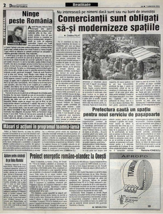 DEȘTEPTAREA307 noiembrie 2002 Deșteptarea7 noiembrie 2019AcțiuneFacebookTwitterWhatsAppTelegramVK AcțiuneFacebookTwitterWhatsAppTelegramVK Fotbalul băcăuan la 360 de gradeDepopularea continuă dar septembrie aduce o surpriză demograficăCum să ai grijă corect de parfumul tăuHandbal juvenil: Prima ediție a Memorialului „Marcel Păunică”Polițiștii băcăuani, în sprijinul comunității: recomandări pentru sărbători în siguranțăIntervenție laparoscopică reușită pentru tratarea infertilității cauzate de varicocel40 de kilograme de articole pirotehnice, deținute ilegal, descoperite de polițiștii băcăuaniCând se organizează Alaiul Datinilor și Obiceiurilor de Iarnă în BacăuTrei cazuri noi de gripă și peste 1.500 de infecții respiratorii în județul BacăuConcursul Național Interdisciplinar „Vrănceanu – Procopiu” Bacău, ediția a XXIV-a, 2025Cum transformă perdelele atmosfera din orice locuință„Once Upon a Ball – Povestea Bobocilor” de la Liceul „Borcea” Buhuși
