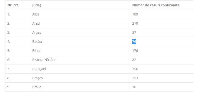 În județul Bacău au fostanunțate 76 de persoane infectate cu noul coronavirus.