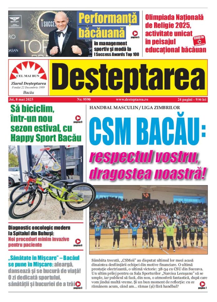 8 mai 2025 Deșteptarea8 mai 2025AcțiuneFacebookTwitterWhatsAppTelegramVK AcțiuneFacebookTwitterWhatsAppTelegramVK Rezultatele finale ale Concursului Interdisciplinar „Vrănceanu – Procopiu” Bacău, ediția a XXIV-a, 2025Fotbal: Ne-a părăsit Ioan Sdrobiș!Insula Misterioasă la balul Bobocilor de la Liceul Teoretic „Henri Coandă” BacăuZiua Internațională a Voluntariatului celebrată prin concurs de mediu la Palatul Copiilor BacăuU17 FC Viitorul Onești, calificare dramatică în optimile Cupei RomânieiObținerea permisului de conducere, mai simplă: cazierul judiciar este verificat direct la ghișeuAvertisment dur de la Garda de Mediu Bacău: un operator economic din Ardeoani, sancționat drastic pentru poluareJandarmii băcăuani i-au adus căldură lui Nea Vasile, 74 de aniFotbal/ Liga 3: Viitorul Onești câștigă, FC Bacău 2 încheie la egalitate un meci dramatic, iar Aerostar pierde acasăClubul Sportiv Bronx, rezultate remarcabile la competiția din Houlegate, FranțaConferința „Excelență, inovație și performanță în medicină” – un eveniment de referință pentru comunitatea medicală băcăuanăSub semnul recunoștinței și al binelui comun la hramul bisericii „Sfântul Nicolae” din Bacău