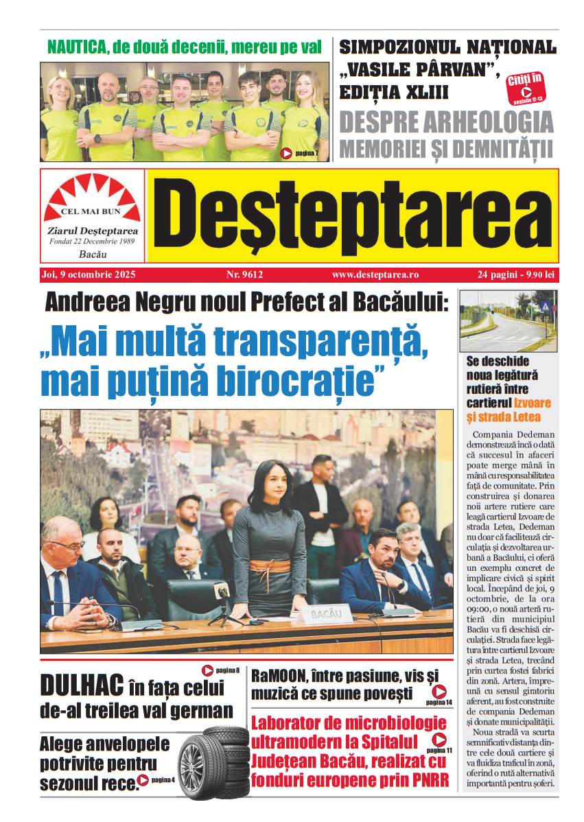 9 octombrie 2025 Deșteptarea9 octombrie 2025AcțiuneFacebookTwitterWhatsAppTelegramVK AcțiuneFacebookTwitterWhatsAppTelegramVK U17 FC Viitorul Onești, calificare dramatică în optimile Cupei RomânieiObținerea permisului de conducere, mai simplă: cazierul judiciar este verificat direct la ghișeuAvertisment dur de la Garda de Mediu Bacău: un operator economic din Ardeoani, sancționat drastic pentru poluareJandarmii băcăuani i-au adus căldură lui Nea Vasile, 74 de aniFotbal/ Liga 3: Viitorul Onești câștigă, FC Bacău 2 încheie la egalitate un meci dramatic, iar Aerostar pierde acasăClubul Sportiv Bronx, rezultate remarcabile la competiția din Houlegate, FranțaConferința „Excelență, inovație și performanță în medicină” – un eveniment de referință pentru comunitatea medicală băcăuanăSub semnul recunoștinței și al binelui comun la hramul bisericii „Sfântul Nicolae” din BacăuElevi ai Liceului Tehnologic Târgu Ocna, în recital la „Sunetul colindelor în inima muntelui de sare”Spitalul din Buhuși va deschide în 2026 un program de chirurgie robotică – un pas major pentru medicina din nord-estul țăriiCând Cel Drept vindecă gârbovirea celei smerite (Luca 13, 10- 17)Duminica a II din Advent