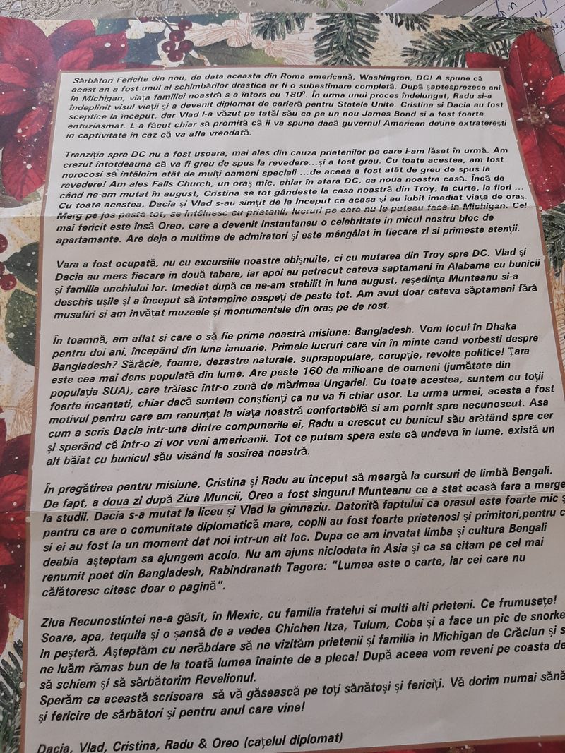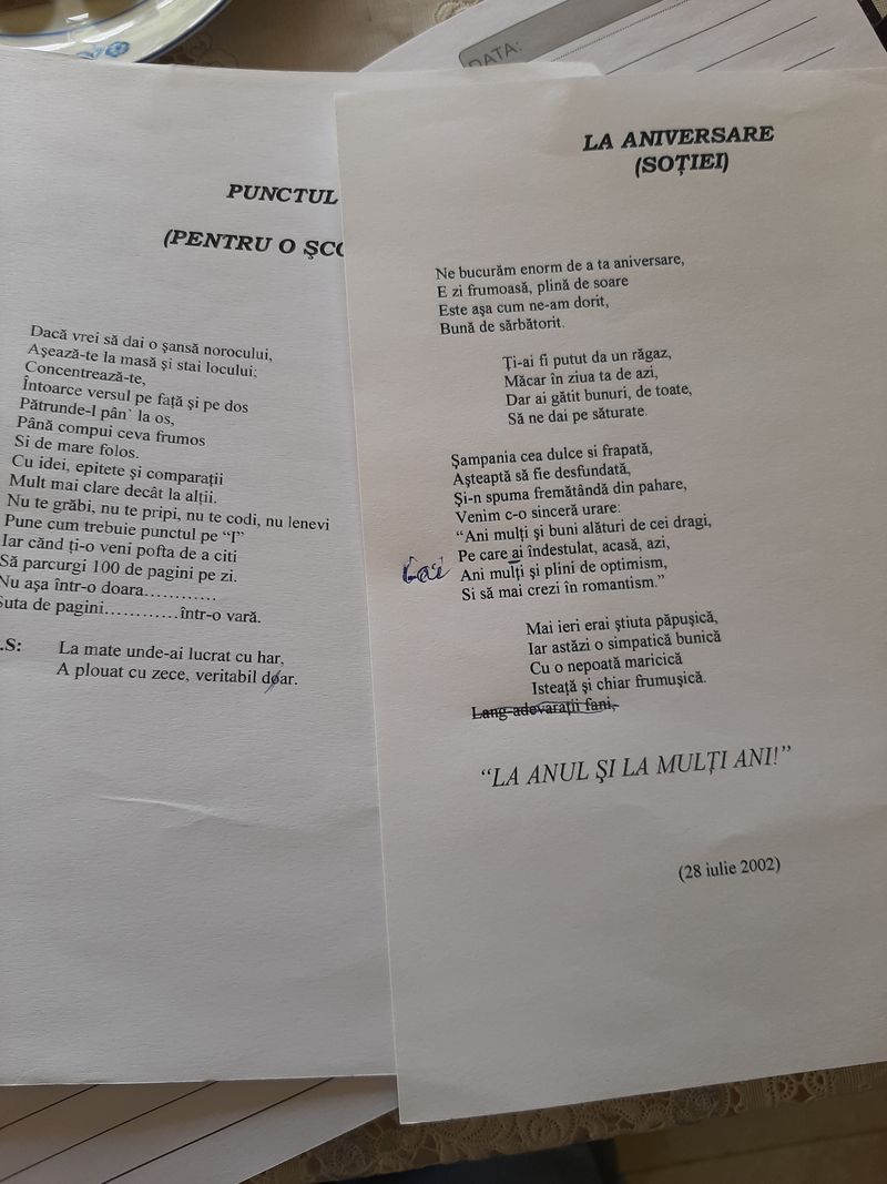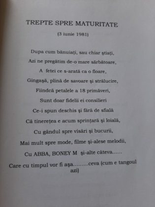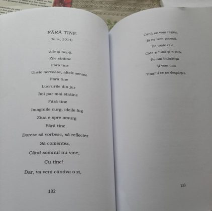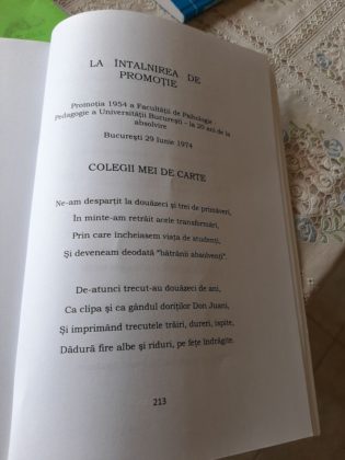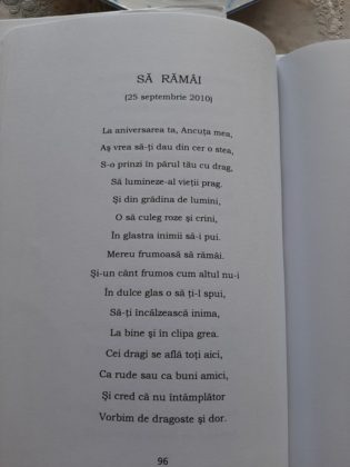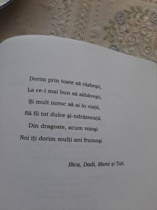 Aceste momente, discuții și trăiri cuprinse-n versuri ne-au îmbogățit viața, ne-au legat și ne-au învățat să iubim necondiționat. Semnează- Ancuța, Mihaela, Tudor și Florin (nepoata, fiica, nepotul și ginerele n.r.).”