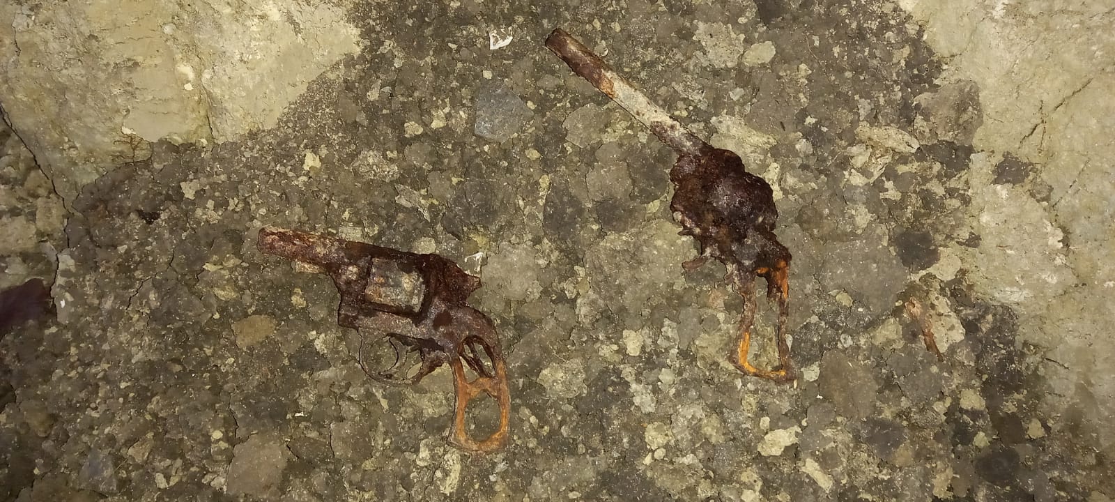 La aproximativ un metru adâncime în pămant, într-o oală de lut, a găsi două pistoale ruginite și, pe lângă mai multe cioburi de ceramică și sticlă, o monedă din anul 1953, datând, probabil, din anul în care au fost ascunse.